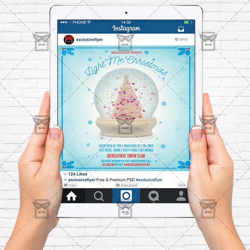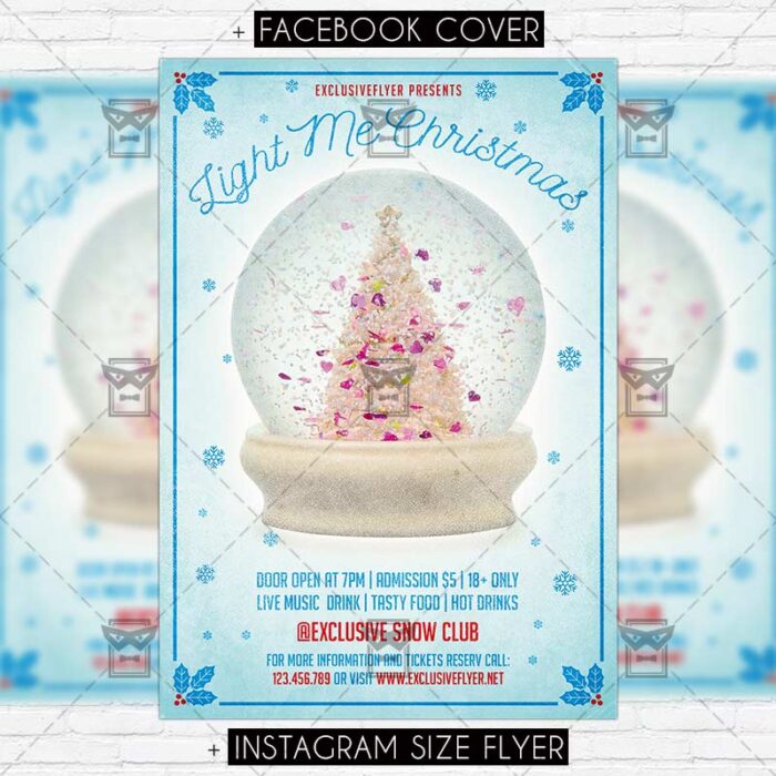 The Light Me Christmas is the exclusive Photoshop PSD flyer template designed by ExclusiveFlyer to promote your Light Me Christmas Party. This is a modern, stylish flyer and just be used for a Christmas Night, Christmas Evening etc. Dear customers! – you can also: Customize any flyers or Hire Us to create any unique product. Also, you can get unlimited access to all our templates. You can buy 1 month membership, 3 or 6 months membership or even 1 year membership plan and login on site, choose a design, click the button DOWNLOAD TEMPLATE and it’s yours. No hassle, no checkout! When you paid the template, you can find it in your personal account and of course you’ve got a message to your e-mail (maybe in spam) with link to download. Also, you can find all templates, which you buy, in your personal account! All of our flyers have a very good quality (300DPI). And it means that you just need to download one of them and make the necessary modifications such as replace the elements or choose the colors and start to invite your guests! You can order from us design of Banner Ad, Bi-Fold Brochure, Tri-Fold Brochure, Business Card, Logo, One-Sided Flyer, Two-sided Flyer or Postcard. All you need is to checkout and write us all information on our e-mail or skype. (order now). There are a lot of free flyer templates, free business card templates on our site! Also there are a lot of categories of flyers such as club flyers, seasonal flyers, sport flyers and also business flyers. You have a great choise on our site, so good luck! Don’t forget to follow our Facebook community, our page on Twitter, on Pinterest and on Tumblr and leave comments, cause we work for you! PSD is set up in 1275×1875 dimension (4” x 6” with 0,25” bleed). The PSD file is very well organised, with color coded groups and layers named appropriately. Remember, all stock images of models and other people used only for demonstration all charms of the flyer and don’t included in the download!