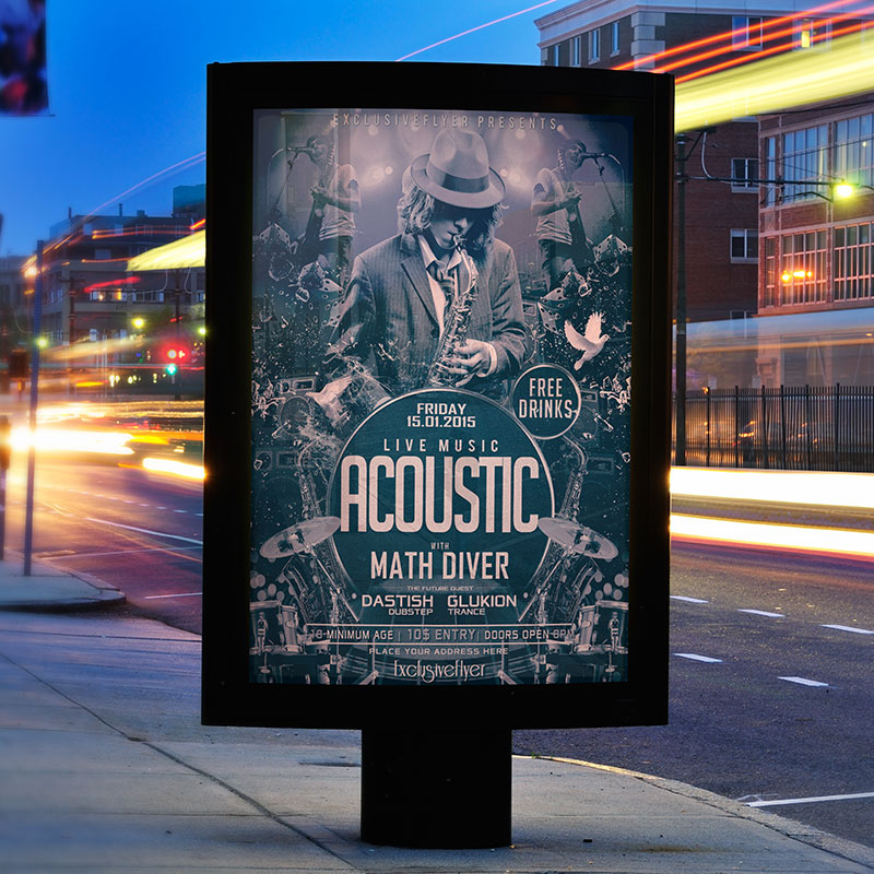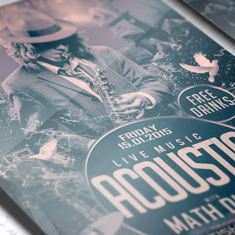 The Live Acoustic Music is the exclusive Photoshop PSD flyer template designed by ExclusiveFlyer to promote your Live Acoustic Music. This is a modern, stylish flyer and just be used for a Live Acoustic Music Party or Music Night. Dear customers! – you can also: Customize any flyers or Hire Us to create any unique product. Also, you can get unlimited access to all our templates. You can buy 1 month membership, 3 or 6 months membership or even 1 year membership plan and login on site, choose a design, click the button DOWNLOAD TEMPLATE and it’s yours. No hassle, no checkout! When you paid the template, you can find it in your personal account and of course you’ve got a message to your e-mail (maybe in spam) with link to download. Also, you can find all templates, which you buy, in your personal account! All of our flyers have a very good quality (300DPI). And it means that you just need to download one of them and make the necessary modifications such as replace the elements or choose the colors and start to invite your guests! You can order from us design of Banner Ad, Bi-Fold Brochure, Tri-Fold Brochure, Business Card, Logo, One-Sided Flyer, Two-sided Flyer or Postcard. All you need is to checkout and write us all information on our e-mail or skype. (order now). There are a lot of free flyer templates, free business card templates on our site! Also there are a lot of categories of flyers such as club flyers, seasonal flyers, sport flyers and also business flyers. You have a great choise on our site, so good luck! Don’t forget to follow our Facebook community, our page on Twitter, on Pinterest and on Tumblr and leave comments, cause we work for you! PSD is set up in 1275×1875 dimension (4″×6″ with 0,25″ bleed). The PSD file is very well organised, with color coded groups and layers named appropriately. Remember, all stock images of models and other people used only for demonstration all charms of the flyer and don’t included in the download!