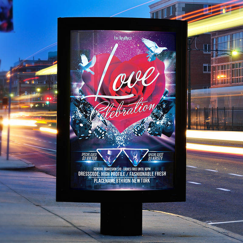 The Love Celebration is the exclusive Photoshop PSD flyer template designed by ExclusiveFlyer to promote your Love Celebration Party. This is a modern, stylish flyer and just be used for a Valentines Party or Love Night. Dear customers! – you can also: Customize any flyers or Hire Us to create any unique product. Also, you can get unlimited access to all our templates. You can buy 1 month membership, 3 or 6 months membership or even 1 year membership plan and login on site, choose a design, click the button DOWNLOAD TEMPLATE and it’s yours. No hassle, no checkout! When you paid the template, you can find it in your personal account and of course you’ve got a message to your e-mail (maybe in spam) with link to download. Also, you can find all templates, which you buy, in your personal account! All of our flyers have a very good quality (300DPI). And it means that you just need to download one of them and make the necessary modifications such as replace the elements or choose the colors and start to invite your guests! You can order from us design of Banner Ad, Bi-Fold Brochure, Tri-Fold Brochure, Business Card, Logo, One-Sided Flyer, Two-sided Flyer or Postcard. All you need is to checkout and write us all information on our e-mail or skype. (order now). There are a lot of free flyer templates, free business card templates on our site! Also there are a lot of categories of flyers such as club flyers, seasonal flyers, sport flyers and also business flyers. You have a great choise on our site, so good luck! Don’t forget to follow our Facebook community, our page on Twitter, on Pinterest and on Tumblr and leave comments, cause we work for you! PSD is set up in 1275×1875 dimension (4″×6″ with 0,25″ bleed). The PSD file is very well organised, with color coded groups and layers named appropriately. Remember, all stock images of models and other people used only for demonstration all charms of the flyer and don’t included in the download!