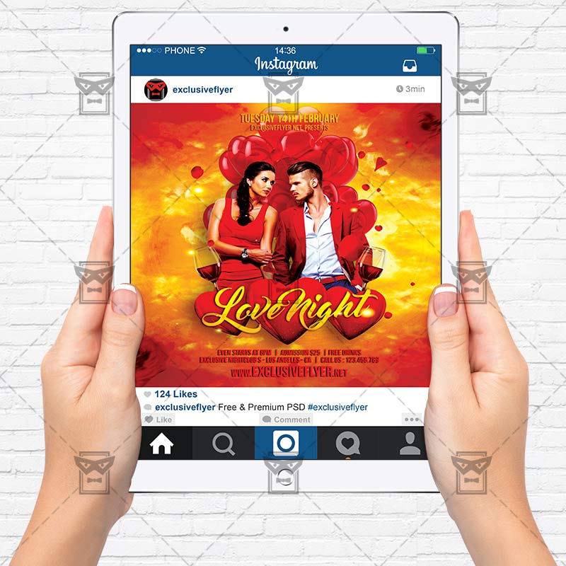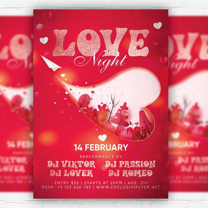 The Love Night is the exclusive Photoshop PSD flyer template designed by ExclusiveFlyer to promote your Love Night. This is a modern, stylish flyer and just be used for a Valentine’s Day Party, Cupid Night, Hearts Party etc. Dear customers! – you can also: Customize any flyers or Hire Us to create any unique product. Also, you can get unlimited access to all our templates. You can buy 1 month membership, 3 or 6 months membership or even 1 year membership plan and login on site, choose a design, click the button DOWNLOAD TEMPLATE and it’s yours. No hassle, no checkout! When you paid the template, you can find it in your personal account and of course you’ve got a message to your e-mail (maybe in spam) with link to download. Also, you can find all templates, which you buy, in your personal account! All of our flyers have a very good quality (300DPI). And it means that you just need to download one of them and make the necessary modifications such as replace the elements or choose the colors and start to invite your guests! You can order from us design of Banner Ad, Bi-Fold Brochure, Tri-Fold Brochure, Business Card, Logo, One-Sided Flyer, Two-sided Flyer or Postcard. All you need is to checkout and write us all information on our e-mail or skype. (order now). There are a lot of free flyer templates, free business card templates on our site! Also there are a lot of categories of flyers such as club flyers, seasonal flyers, sport flyers and also business flyers. You have a great choise on our site, so good luck! Don’t forget to follow our Facebook community, our page on Twitter, on Pinterest and on Tumblr and leave comments, cause we work for you! PSD is set up in 1275×1875 dimension (4” x 6” with 0,25” bleed). The PSD file is very well organised, with color coded groups and layers named appropriately. Remember, all stock images of models and other people used only for demonstration all charms of the flyer and don’t included in the download!
