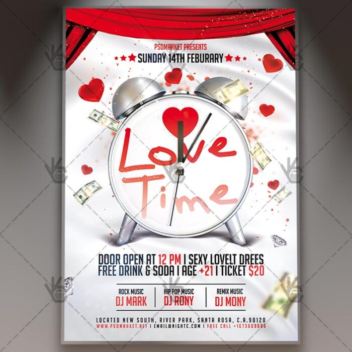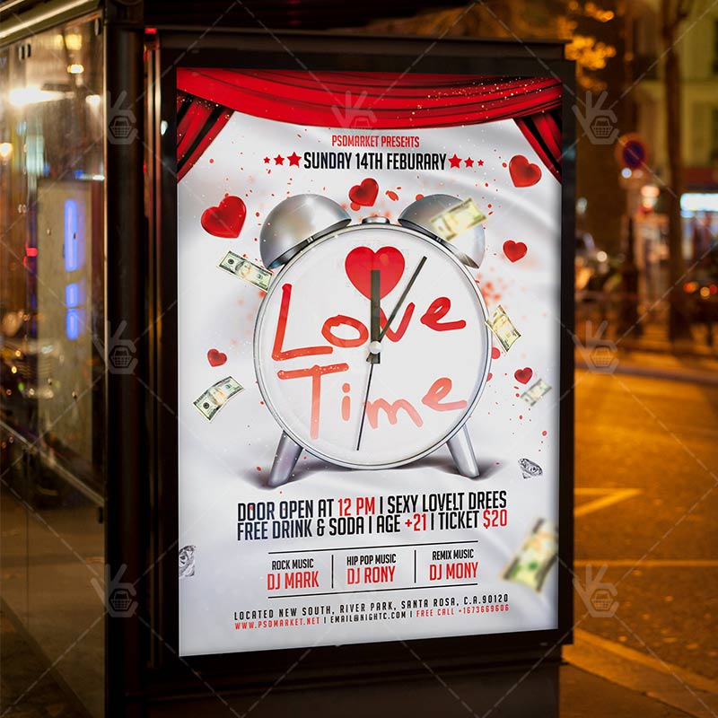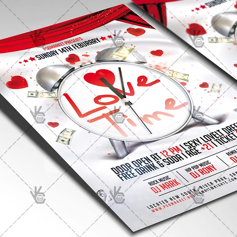Love Time is a simply modern flyer design by PSDmarket Team to be used with Photoshop CS3 and higher. Save your time and use it for business or for your clients! This can be use for Valentines Day, Valentine Day, Valentines Festival, Valentines Party, Valentines Celebration, Valentines Night, Valentines Event and others.