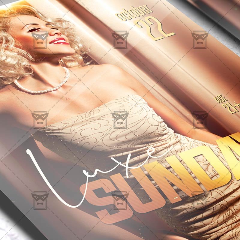 Luxe Sundays an exclusive PSD flyer template for Adobe Photoshop designed by our best graphic designers to facilitate your task in promoting your business. With our readymade Club flyer in psd format you can invite you customers and guest to your event or to the best Luxury Party, Luxury Sundays, VIP Sundays or Luxe Club Party in their lives.