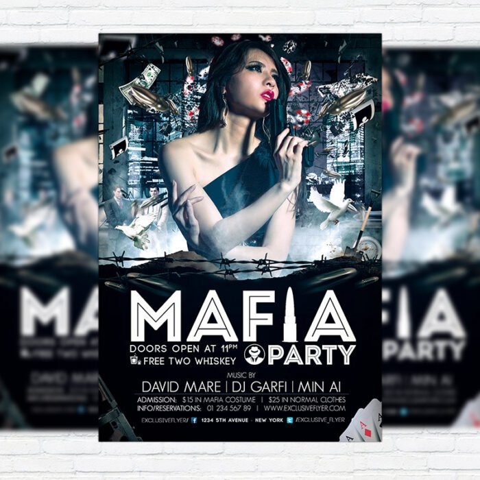 The Mafia Party is the exclusive Photoshop PSD flyer template designed by ExclusiveFlyer to promote your Mafia Party. This is a modern, stylish flyer and just be used for a Mafia Night or Gangster Party, or Gangster Night. Dear customers! – you can also: Customize any flyers or Hire Us to create any unique product. Also, you can get unlimited access to all our templates. You can buy 1 month membership, 3 or 6 months membership or even 1 year membership plan and login on site, choose a design, click the button DOWNLOAD TEMPLATE and it’s yours. No hassle, no checkout! When you paid the template, you can find it in your personal account and of course you’ve got a message to your e-mail (maybe in spam) with link to download. Also, you can find all templates, which you buy, in your personal account! All of our flyers have a very good quality (300DPI). And it means that you just need to download one of them and make the necessary modifications such as replace the elements or choose the colors and start to invite your guests! You can order from us design of Banner Ad, Bi-Fold Brochure, Tri-Fold Brochure, Business Card, Logo, One-Sided Flyer, Two-sided Flyer or Postcard. All you need is to checkout and write us all information on our e-mail or skype. (order now). There are a lot of free flyer templates, free business card templates on our site! Also there are a lot of categories of flyers such as club flyers, seasonal flyers, sport flyers and also business flyers. You have a great choise on our site, so good luck! Don’t forget to follow our Facebook community, our page on Twitter, on Pinterest and on Tumblr and leave comments, cause we work for you! PSD is set up in 1275×1875 dimension (4″×6″ with 0,25″ bleed). The PSD file is very well organised, with color coded groups and layers named appropriately. Remember, all stock images of models and other people used only for demonstration all charms of the flyer and don’t included in the download!