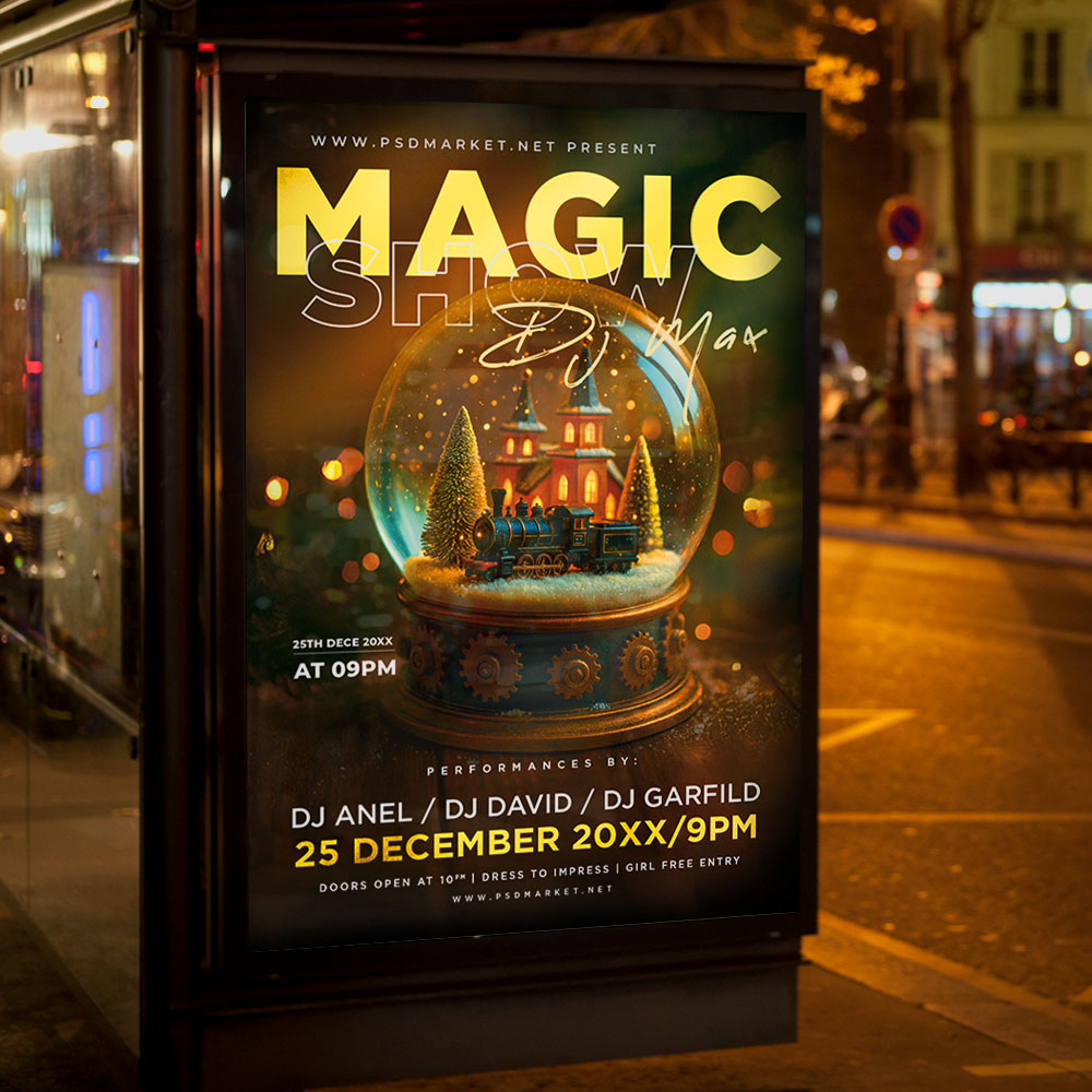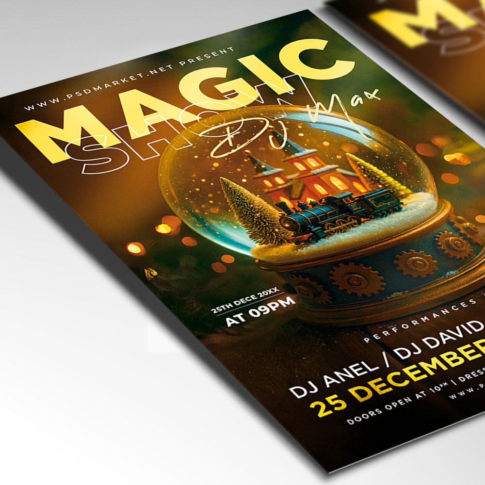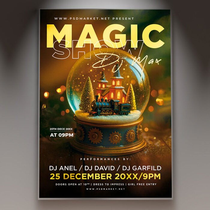 Magic Show Flyer PSD TemplateUnveil the mystery and draw a crowd to your illusions! Our enchanting **Magic Show Flyer PSD Template** is the perfect design tool for promoting any kind of performance art event, including a grand stage magic show, a close-up illusionist performance, a comedy magic act, or a mysterious theatrical production. This professional PSD template offers full customizability to ensure your show looks as captivating, mysterious, and professional as the tricks themselves. If you’re looking to create an irresistible invitation that screams “**Experience the Unbelievable**,” “**An Evening of Grand Illusion**,” and “**Prepare to Be Amazed**,” this flyer template is engineered to draw a huge, curious crowd ready to be entertained. Expect to see striking visuals, often incorporating thematic elements like top hats, playing cards, dove silhouettes, mysterious smoke or glowing effects, sophisticated typography, and a dramatic color scheme (typically featuring deep red, black, gold/silver, and deep blue/purple) that perfectly captures the intriguing and exciting spirit of a **Magic Show Event**. This template is all about setting a captivating, mysterious, and memorable mood, making your performance the must-see spectacle. The **Magic Show Flyer PSD Template** offers a highly adaptable and professional layout (as a PSD file), ensuring you can clearly communicate all the essential details of your show while perfectly maintaining its air of mystery. You can easily customize the text fields to include the specific date and time of the performance, the theater or venue location, any special entry requirements (e.g., ticket purchase details, box office information, special VIP seating), and information about featured entertainment (e.g., the **headlining illusionist**, a special guest act, a mentalist segment), details on **special ticket bundles** or **exclusive backstage passes**, or information about a charity component, all presented in a clear and appealing way. Add an enticing description of what attendees can expect, perhaps highlighting opportunities for audience participation, a truly impossible feat of illusion, or simply an evening of pure, high-class entertainment. And of course, include clear contact information or prominent social media handles for further engagement and ticket sales. Being a PSD template, it offers exciting options to incorporate additional dynamic graphics like light rays, stylized occult symbols, or elegant velvet textures, or to adjust the impactful color palette to perfectly match your brand’s aesthetic or the show’s specific vibe. This lets you create a truly unique and memorable promotional piece that looks as professional and intriguing as your Magic Show feels. Engineered for maximum reach, the **Magic Show Flyer PSD Template** is designed to be both print-ready for stunning physical distribution and seamlessly optimized for digital sharing. This ensures your exciting invitation reaches a wide and enthusiastic audience. Create eye-catching physical flyers to distribute at high-traffic areas, and effortlessly share the flyer digitally through various social media channels with engaging captions that hint at the mystery, email announcements that build anticipation, and online event listings that attract theater-goers and magic enthusiasts. This dual functionality helps to maximize visibility and create significant buzz around your Magic Show. By utilizing this distinctive and attention-grabbing flyer template, you’re not just announcing a show; you’re creating an invitation that broadcasts pure, theatrical excitement and promises an experience filled with wonder, mystery, and unforgettable illusions, making your “**Magic Show Event**” the essential destination for entertainment. Grab this template today and get ready to pull off a successful show! — Features of the Magic Show Flyer PSD Template