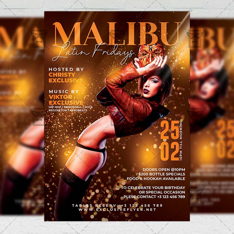 Malibu Latin Nights Template an exclusive PSD flyer template for Adobe Photoshop designed by our best graphic designers to facilitate your task in promoting your business. With our readymade Club flyer in psd format you can invite you customers and guest to your event or to the best Latin Night, Latin party, Malibu Night, Latin Dance Night, Latin Party or Sexy Malibu Night in their lives.