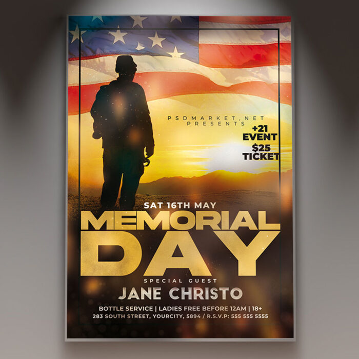 Memorial Day Flag Flyer TemplateShow your patriotism and commemorate Memorial Day with our Memorial Day Flag Flyer Template. This design prominently features the American flag, making it perfect for announcing your Memorial Day events, tributes, and gatherings. The Memorial Day Flag Flyer Template ensures your message is both visually striking and deeply connected to the spirit of Memorial Day. Easily customize the text to include the date (the last Monday of May), time, location, and details of your event or message. The central element of this template is the American flag, often displayed in various styles – waving, draped, or as part of a symbolic design – to evoke a sense of national pride and remembrance. This flyer template is designed to be instantly recognizable and emotionally resonant for Memorial Day in the US. The high-resolution PSD file is fully editable in Adobe Photoshop, allowing you to adjust colors, fonts, and add specific details about your event or organization. Whether you are hosting a community gathering, a memorial service, a parade, or simply sharing a message of remembrance, this template provides a powerful and visually appropriate way to communicate through both digital and printed materials. Features of the Memorial Day Flag Flyer Template