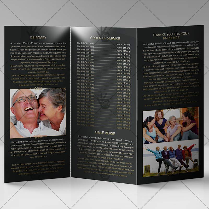 Memorial Program is a simply modern tri-fold brochure design by PSDmarket Team to be used with Photoshop CS3 and higher. Save your time and use it for business or for your clients! This can be use for Memorial Program, Funeral Program, Obituary Program, Church Event, Pastor Anniversary or Hope Pastor Appreciation and others.