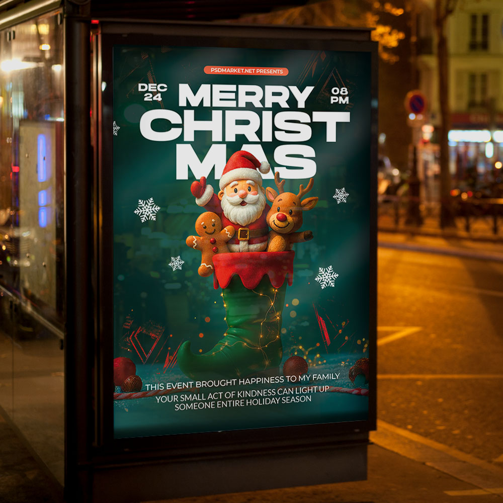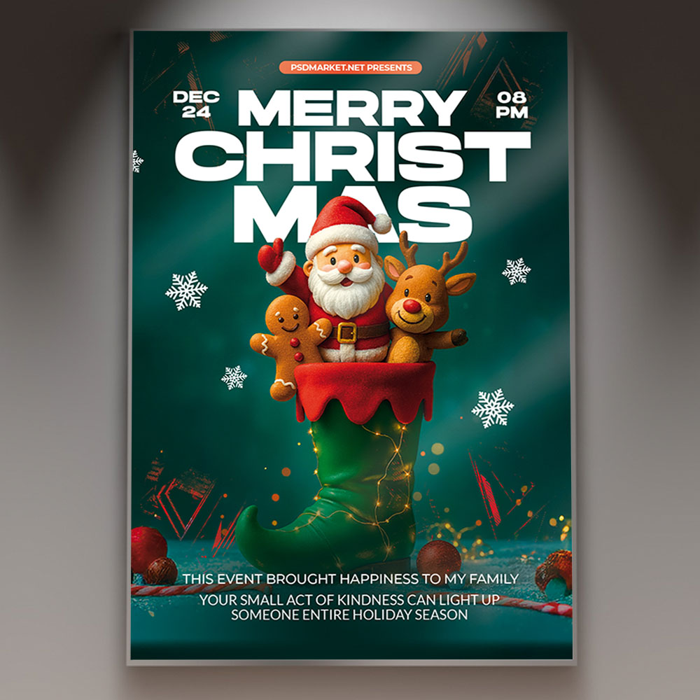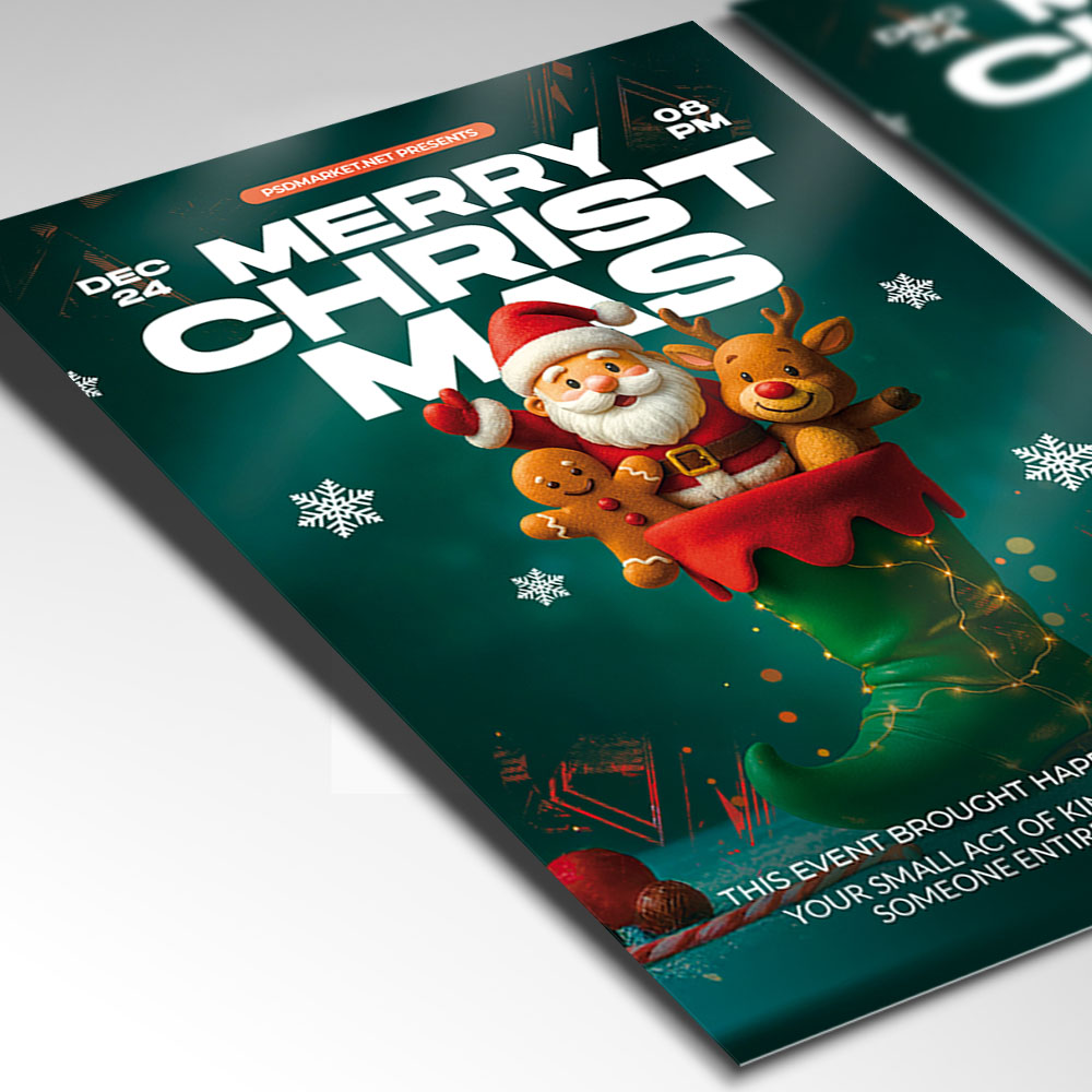Merry Christmas Happy Flyer PSD TemplateSpread the ultimate holiday cheer with a bright and joyful invitation! Our wonderfully festive **Merry Christmas Happy Flyer PSD Template** is the ideal design tool for promoting any cheerful holiday event—from a warm family gathering, a festive community bazaar, a cozy corporate party, or a seasonal promotion emphasizing happiness and good tidings. This professional PSD template offers full customizability to ensure your event looks as bright, spirited, and welcoming as the heart of the holiday season. If you’re looking to create an irresistible invitation that screams “**Merry Christmas & Happy Holidays!**,” “**Join the Festive Fun**,” and “**Celebrate the Most Wonderful Time of the Year**,” this flyer template is engineered to draw a huge, enthusiastic crowd ready to embrace the joy of the season. Expect to see striking visuals, often incorporating classic, cheerful Christmas elements like festive lights, brightly wrapped gifts, happy holiday typography (including script or playful fonts), and a traditional, bright holiday color scheme (primarily vibrant reds, crisp whites, and metallic gold/green accents) that perfectly captures the warm and communal spirit of a joyful **Merry Christmas Happy Event**. This template is all about setting a warm, optimistic, and memorable mood, making your gathering the essential destination for holiday celebration. The **Merry Christmas Happy Flyer PSD Template** offers a highly adaptable and professional layout (as a PSD file), ensuring you can clearly communicate all the essential details of your celebration while perfectly maintaining its cheerful atmosphere. You can easily customize the text fields to include the specific date and time of your event (Christmas Eve, Christmas Day, or any date in December), the venue location, any special entry requirements (e.g., ticket purchase details, a request for toy donations, a potluck sign-up), and information about featured entertainment (e.g., **caroling**, holiday movies, children’s activities, a gift exchange), details on **festive treats and beverages**, or information about a special holiday message, all presented in a clear and appealing way. Add an enticing description of what attendees can expect, perhaps highlighting opportunities for **meeting Santa**, cozy photo areas, or simply enjoying the warmth and companionship of the season. And of course, include clear contact information or prominent social media handles for further engagement and RSVPs. Being a PSD template, it offers exciting options to incorporate additional dynamic graphics like light flares, subtle snow effects, or glittering textures, or to adjust the impactful color palette to perfectly match your brand’s aesthetic or the event’s specific vibe. This lets you create a truly unique and memorable promotional piece that looks as festive and exciting as your Merry Christmas Happy celebration feels. Engineered for maximum reach, the **Merry Christmas Happy Flyer PSD Template** is designed to be both print-ready for stunning physical distribution and seamlessly optimized for digital sharing. This ensures your exciting invitation reaches a wide and enthusiastic audience. Create eye-catching physical flyers to distribute at high-traffic areas, and effortlessly share the flyer digitally through various social media channels with engaging captions that highlight the holiday fun, email announcements that build anticipation, and online event listings that attract revelers and guests. This dual functionality helps to maximize visibility and create significant buzz around your Merry Christmas Happy Event. By utilizing this distinctive and attention-grabbing flyer template, you’re not just announcing a party; you’re creating an invitation that broadcasts pure, festive joy and promises an experience filled with great cheer, holiday warmth, and unforgettable memories, making your “**Merry Christmas Happy Event**” the essential destination to celebrate the season. Grab this template today and spread the ultimate holiday joy! — Features of the Merry Christmas Happy Flyer PSD Template