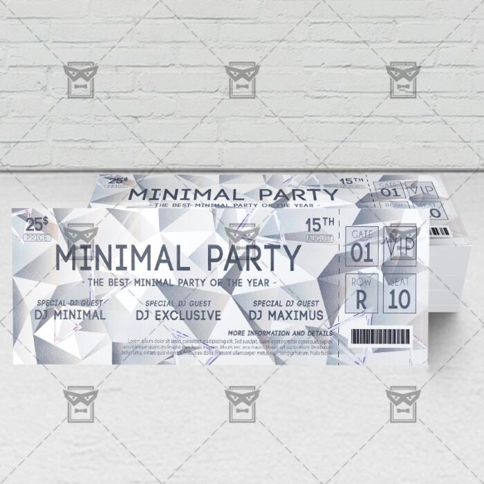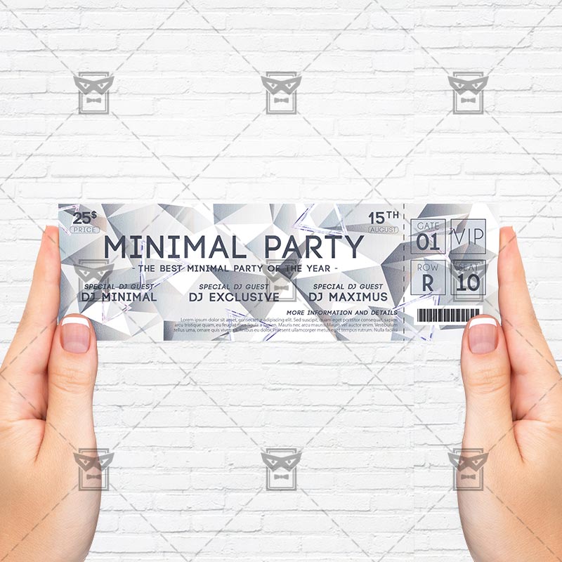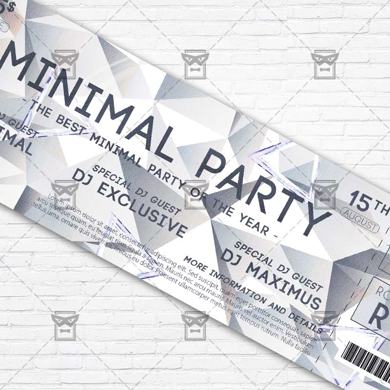 The Minimal Event Ticket is the exclusive Photoshop PSD ticket template designed by ExclusiveFlyer to promote your Minimal Event Party. This is a modern, stylish ticket and just be used for a Electro Party, Minimal Party, Geometric Night etc. Dear customers! – you can also: Customize any flyers or Hire Us to create any unique product. Also, you can get unlimited access to all our templates. You can buy 1 month membership, 3 or 6 months membership or even 1 year membership plan and login on site, choose a design, click the button DOWNLOAD TEMPLATE and it’s yours. No hassle, no checkout! When you paid the template, you can find it in your personal account and of course you’ve got a message to your e-mail (maybe in spam) with link to download. Also, you can find all templates, which you buy, in your personal account! All of our flyers have a very good quality (300DPI). And it means that you just need to download one of them and make the necessary modifications such as replace the elements or choose the colors and start to invite your guests! You can order from us design of Banner Ad, Bi-Fold Brochure, Tri-Fold Brochure, Business Card, Logo, One-Sided Flyer, Two-sided Flyer or Postcard. All you need is to checkout and write us all information on our e-mail or skype. (order now). There are a lot of free flyer templates, free business card templates on our site! Also there are a lot of categories of flyers such as club flyers, seasonal flyers, sport flyers and also business flyers. You have a great choise on our site, so good luck! Don’t forget to follow our Facebook community, our page on Twitter, on Pinterest and on Tumblr and leave comments, cause we work for you! PSD is set up in 2175×675 dimension (7” x 2” with 0,25” bleed). The PSD file is very well organised, with color coded groups and layers named appropriately. Remember, all stock images of models and other people used only for demonstration all charms of the flyer and don’t included in the download!