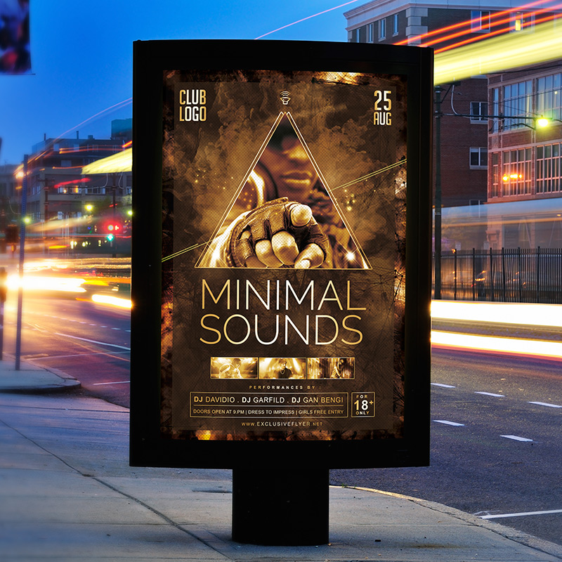 The Minimal Sounds is the exclusive Photoshop PSD flyer template designed by ExclusiveFlyer to promote your Minimal Sounds Party. This is a modern, stylish, electro flyer and just be used for a Electro Party or Futuristic Night or Electro Session etc. Dear customers! – you can also: Customize any flyers or Hire Us to create any unique product. Also, you can get unlimited access to all our templates. You can buy 1 month membership, 3 or 6 months membership or even 1 year membership plan and login on site, choose a design, click the button DOWNLOAD TEMPLATE and it’s yours. No hassle, no checkout! When you paid the template, you can find it in your personal account and of course you’ve got a message to your e-mail (maybe in spam) with link to download. Also, you can find all templates, which you buy, in your personal account! All of our flyers have a very good quality (300DPI). And it means that you just need to download one of them and make the necessary modifications such as replace the elements or choose the colors and start to invite your guests! You can order from us design of Banner Ad, Bi-Fold Brochure, Tri-Fold Brochure, Business Card, Logo, One-Sided Flyer, Two-sided Flyer or Postcard. All you need is to checkout and write us all information on our e-mail or skype. (order now). There are a lot of free flyer templates, free business card templates on our site! Also there are a lot of categories of flyers such as club flyers, seasonal flyers, sport flyers and also business flyers. You have a great choise on our site, so good luck! Don’t forget to follow our Facebook community, our page on Twitter, on Pinterest and on Tumblr and leave comments, cause we work for you! PSD is set up in 1275×1875 dimension (4″×6″ with 0,25″ bleed). The PSD file is very well organised, with color coded groups and layers named appropriately. Remember, all stock images of models and other people used only for demonstration all charms of the flyer and don’t included in the download!