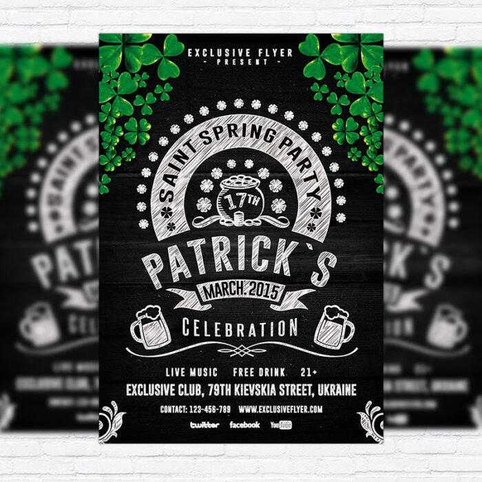 The Minimal St. Patrick’s Day is the exclusive Photoshop PSD flyer template designed by ExclusiveFlyer to promote your Minimal Saint Patrick’s Day. This is a modern, stylish, green flyer and just be used for a Saint Patrick’s Day or maybe Beer Party. Dear customers! – you can also: Customize any flyers or Hire Us to create any unique product. Also, you can get unlimited access to all our templates. You can buy 1 month membership, 3 or 6 months membership or even 1 year membership plan and login on site, choose a design, click the button DOWNLOAD TEMPLATE and it’s yours. No hassle, no checkout! When you paid the template, you can find it in your personal account and of course you’ve got a message to your e-mail (maybe in spam) with link to download. Also, you can find all templates, which you buy, in your personal account! All of our flyers have a very good quality (300DPI). And it means that you just need to download one of them and make the necessary modifications such as replace the elements or choose the colors and start to invite your guests! You can order from us design of Banner Ad, Bi-Fold Brochure, Tri-Fold Brochure, Business Card, Logo, One-Sided Flyer, Two-sided Flyer or Postcard. All you need is to checkout and write us all information on our e-mail or skype. (order now). There are a lot of free flyer templates, free business card templates on our site! Also there are a lot of categories of flyers such as club flyers, seasonal flyers, sport flyers and also business flyers. You have a great choise on our site, so good luck! Don’t forget to follow our Facebook community, our page on Twitter, on Pinterest and on Tumblr and leave comments, cause we work for you! PSD is set up in 1275×1875 dimension (4″×6″ with 0,25″ bleed). The PSD file is very well organised, with color coded groups and layers named appropriately. Remember, all stock images of models and other people used only for demonstration all charms of the flyer and don’t included in the download!