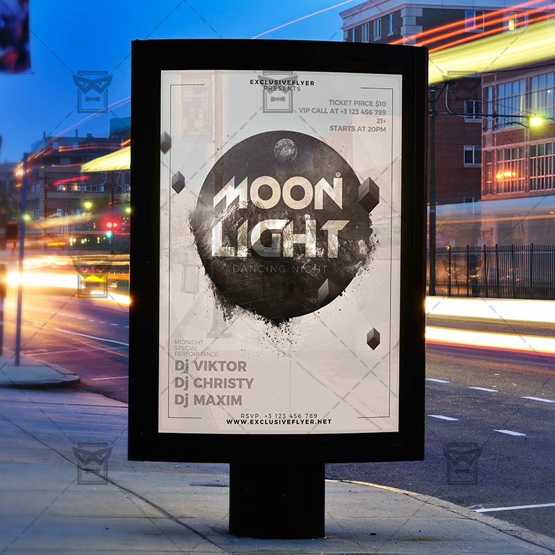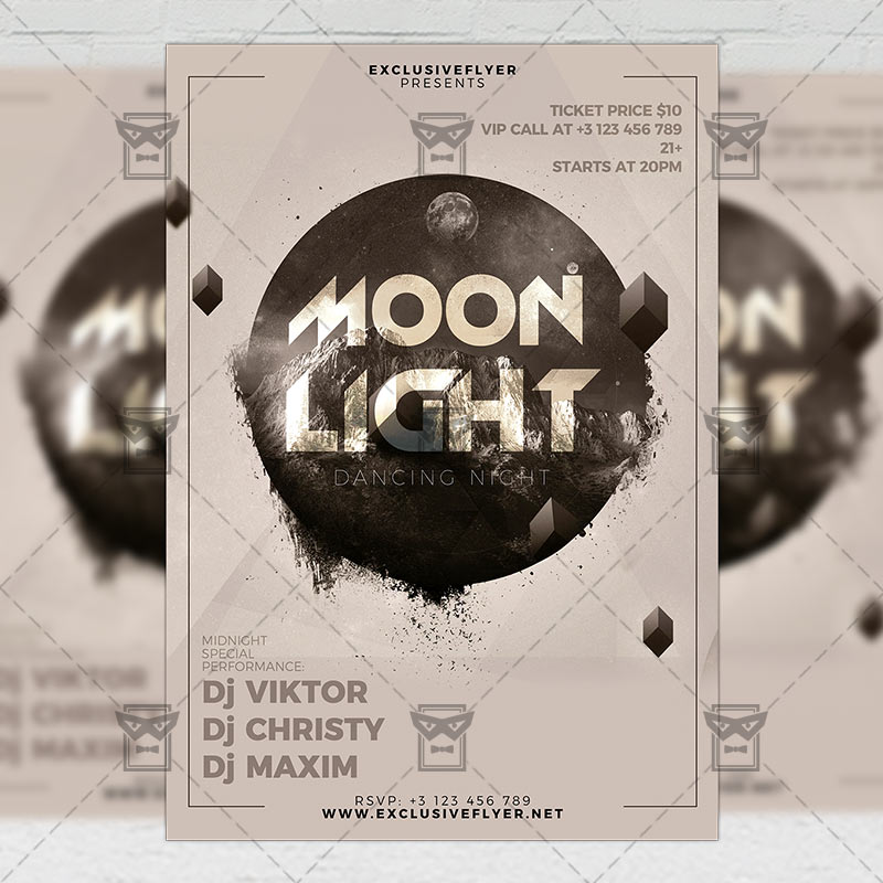 Moon Light Night is an exclusive PSD flyer template for Adobe Photoshop designed by our best graphic designers to facilitate your task in promoting your business. With our readymade Club flyer in psd format you can invite you customers and guest to your event or to the best Moon Party, Minimal Night or Music Festival in their lives.