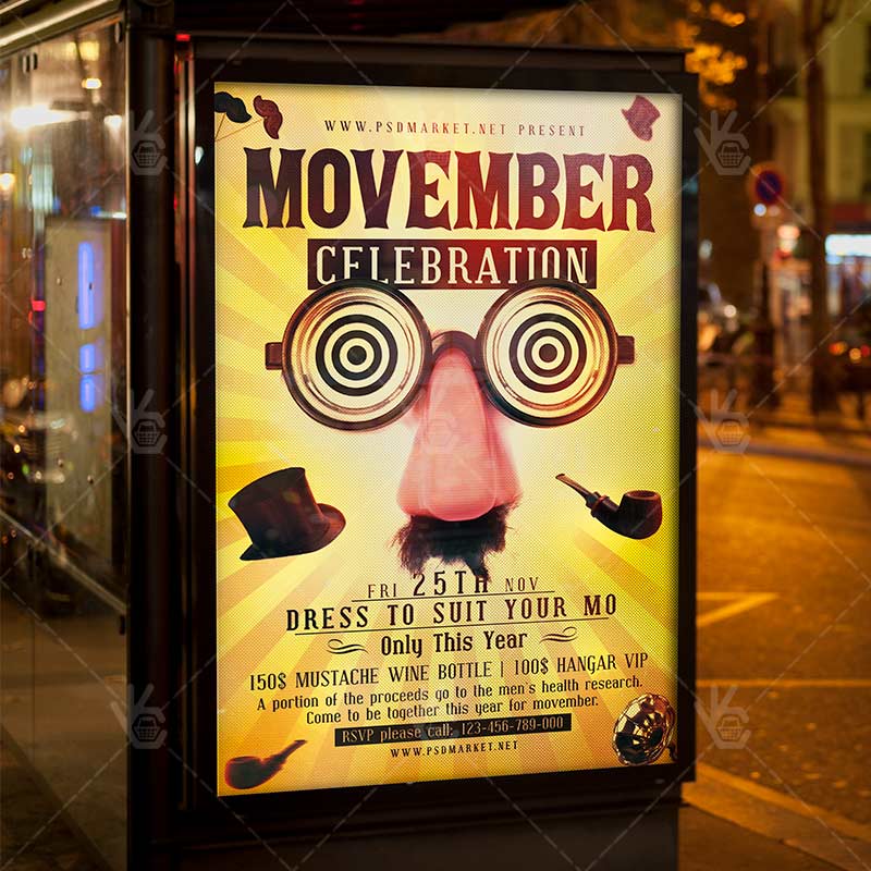 Movember Celebration is a simply modern flyer design by PSDmarket Team to be used with Photoshop CS3 and higher. Save your time and use it for business or for your clients! This can be use for Movember Party, Movember Night, Moustache Party, Moustache Night, Movember Mustaches Party or Moustache Event and others.