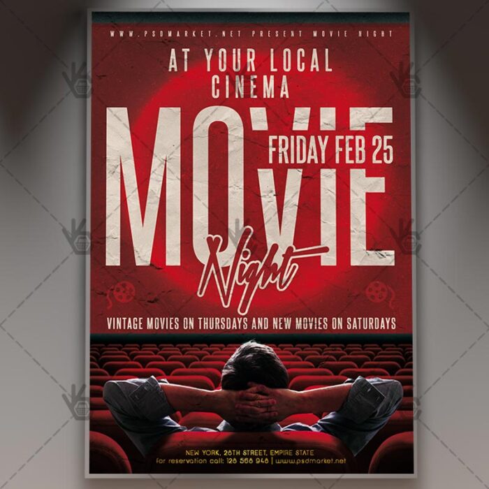 Movie Night is a simply modern flyer design by PSDmarket Team to be used with Photoshop CS3 and higher. Save your time and use it for business or for your clients! This can be use for Movie Party, Movie Festival , Premiere Movie, Film Show, Film Festival or Cinema Night and others.