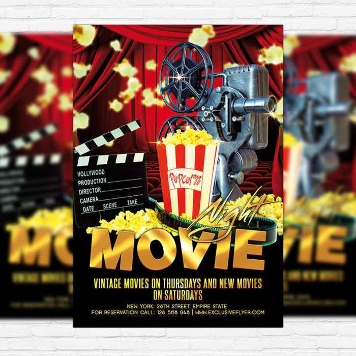 The Movie Night is the exclusive Photoshop PSD flyer template designed by ExclusiveFlyer to promote your Movie Night. This is a modern, stylish flyer and just be used for a Movies Night, Blockbuster Party etc. Dear customers! – you can also: Customize any flyers or Hire Us to create any unique product. Also, you can get unlimited access to all our templates. You can buy 1 month membership, 3 or 6 months membership or even 1 year membership plan and login on site, choose a design, click the button DOWNLOAD TEMPLATE and it’s yours. No hassle, no checkout! When you paid the template, you can find it in your personal account and of course you’ve got a message to your e-mail (maybe in spam) with link to download. Also, you can find all templates, which you buy, in your personal account! All of our flyers have a very good quality (300DPI). And it means that you just need to download one of them and make the necessary modifications such as replace the elements or choose the colors and start to invite your guests! You can order from us design of Banner Ad, Bi-Fold Brochure, Tri-Fold Brochure, Business Card, Logo, One-Sided Flyer, Two-sided Flyer or Postcard. All you need is to checkout and write us all information on our e-mail or skype. (order now). There are a lot of free flyer templates, free business card templates on our site! Also there are a lot of categories of flyers such as club flyers, seasonal flyers, sport flyers and also business flyers. You have a great choise on our site, so good luck! Don’t forget to follow our Facebook community, our page on Twitter, on Pinterest and on Tumblr and leave comments, cause we work for you! PSD is set up in 1275×1875 dimension (4” x 6” with 0,25” bleed). The PSD file is very well organised, with color coded groups and layers named appropriately. Remember, all stock images of models and other people used only for demonstration all charms of the flyer and don’t included in the download!