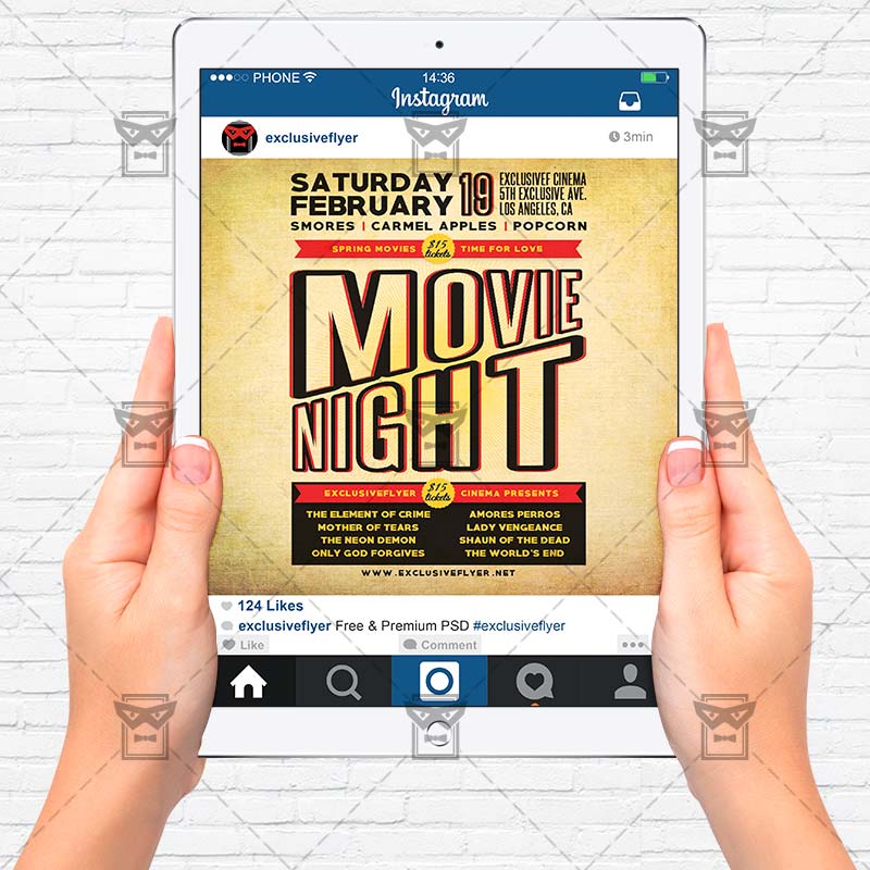 The Movie Night is the exclusive Photoshop PSD flyer template designed by ExclusiveFlyer to promote your Movie Night. This is a modern, stylish flyer and just be used for a Movie Night Party, Cinema Night, Films Party, Popcorn Night etc. Dear customers! – you can also: Customize any flyers or Hire Us to create any unique product. Also, you can get unlimited access to all our templates. You can buy 1 month membership, 3 or 6 months membership or even 1 year membership plan and login on site, choose a design, click the button DOWNLOAD TEMPLATE and it’s yours. No hassle, no checkout! When you paid the template, you can find it in your personal account and of course you’ve got a message to your e-mail (maybe in spam) with link to download. Also, you can find all templates, which you buy, in your personal account! All of our flyers have a very good quality (300DPI). And it means that you just need to download one of them and make the necessary modifications such as replace the elements or choose the colors and start to invite your guests! You can order from us design of Banner Ad, Bi-Fold Brochure, Tri-Fold Brochure, Business Card, Logo, One-Sided Flyer, Two-sided Flyer or Postcard. All you need is to checkout and write us all information on our e-mail or skype. (order now). There are a lot of free flyer templates, free business card templates on our site! Also there are a lot of categories of flyers such as club flyers, seasonal flyers, sport flyers and also business flyers. You have a great choise on our site, so good luck! Don’t forget to follow our Facebook community, our page on Twitter, on Pinterest and on Tumblr and leave comments, cause we work for you! PSD is set up in 1275×1875 dimension (4” x 6” with 0,25” bleed). The PSD file is very well organised, with color coded groups and layers named appropriately. Remember, all stock images of models and other people used only for demonstration all charms of the flyer and don’t included in the download!