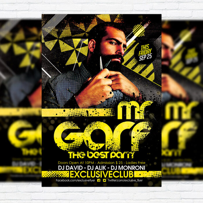 The Mr.Garf is the exclusive Photoshop PSD flyer template designed by ExclusiveFlyer to promote your Mr.Garf Party. This is a modern, stylish, dj flyer and just be used for a Birthday Party or DJ Battle Night or DJ Night etc. Dear customers! – you can also: Customize any flyers or Hire Us to create any unique product. Also, you can get unlimited access to all our templates. You can buy 1 month membership, 3 or 6 months membership or even 1 year membership plan and login on site, choose a design, click the button DOWNLOAD TEMPLATE and it’s yours. No hassle, no checkout! When you paid the template, you can find it in your personal account and of course you’ve got a message to your e-mail (maybe in spam) with link to download. Also, you can find all templates, which you buy, in your personal account! All of our flyers have a very good quality (300DPI). And it means that you just need to download one of them and make the necessary modifications such as replace the elements or choose the colors and start to invite your guests! You can order from us design of Banner Ad, Bi-Fold Brochure, Tri-Fold Brochure, Business Card, Logo, One-Sided Flyer, Two-sided Flyer or Postcard. All you need is to checkout and write us all information on our e-mail or skype. (order now). There are a lot of free flyer templates, free business card templates on our site! Also there are a lot of categories of flyers such as club flyers, seasonal flyers, sport flyers and also business flyers. You have a great choise on our site, so good luck! Don’t forget to follow our Facebook community, our page on Twitter, on Pinterest and on Tumblr and leave comments, cause we work for you! PSD is set up in 1275×1875 dimension (4″×6″ with 0,25″ bleed). The PSD file is very well organised, with color coded groups and layers named appropriately. Remember, all stock images of models and other people used only for demonstration all charms of the flyer and don’t included in the download!