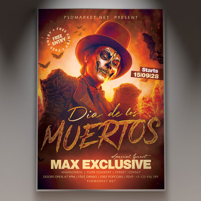 Muertos Flyer TemplateHonor and celebrate in vibrant style with our captivating **Muertos Flyer Template**! This culturally rich and beautiful design is perfect for promoting Día de los Muertos events, Mexican-themed parties, art exhibitions, or any gathering celebrating life and memory. If you’re looking to create an irresistible invitation that whispers “celebrate life,” “remember and rejoice,” and “a night of vibrant tradition,” this flyer template is engineered to draw a diverse and enthusiastic crowd. Expect to see striking visuals, often incorporating traditional elements like intricate sugar skulls (calaveras), marigolds (cempasúchil), colorful papel picado banners, and ornate, folkloric typography that captures the joyful and commemorative spirit of Día de los Muertos. This template is all about setting a festive, respectful, and visually stunning mood, making your “Muertos Event” the ultimate destination for an epic gathering! The **Muertos Flyer Template** offers a highly adaptable and professional layout, ensuring you can clearly communicate all the essential details of your event while perfectly maintaining its artistic and inviting spirit. You can easily customize the text fields to include the specific date and time of your celebration, the lively venue location, any special entry requirements or dress codes (e.g., traditional attire, face paint), and information about featured activities (e.g., face painting, altar building), live entertainment (e.g., Mariachi bands), or enticing food and drink specials (e.g., pan de muerto, tequila), all presented in a clear and appealing way. Add an enticing description of what attendees can expect, perhaps highlighting opportunities for dancing, honoring loved ones on a communal altar (ofrenda), or simply enjoying the rich cultural atmosphere. Detail any exciting features like a designated artist showcase, a costume contest, or a storytelling session. And of course, include clear contact information or prominent social media handles for further engagement and ticket sales. Many templates also provide exciting options to incorporate additional dynamic graphics like subtle light effects, decorative floral patterns, or flickering candle lights, or to adjust the impactful color palette (often deep purples, vibrant oranges, and striking yellows) to perfectly match your brand’s aesthetic or the event’s specific cultural theme. This lets you create a truly unique and memorable promotional piece that looks as authentic and heartfelt as your event feels. Engineered for maximum reach, the **Muertos Flyer Template** is designed to be both print-ready for stunning physical distribution and seamlessly optimized for digital sharing. This ensures your exciting invitation reaches a wide and enthusiastic audience. Create eye-catching physical flyers to distribute at cultural centers, restaurants, art galleries, or through local community groups. Effortlessly share the flyer digitally through various social media channels with engaging captions that highlight the event’s cultural significance, email announcements that build anticipation, and online event listings that attract art lovers, foodies, and anyone looking for a rich and meaningful celebration. This dual functionality helps to maximize visibility and create significant buzz around your Muertos Event. By utilizing this distinctive and attention-grabbing flyer template, you’re not just announcing a party; you’re creating an invitation that broadcasts pure cultural reverence and promises an experience filled with tradition, art, and unforgettable moments, making your “Muertos Event” the ultimate destination for an epic gathering. Grab this template today and prepare to celebrate in style! — Features of the Muertos Flyer Template