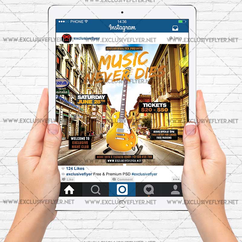 The Music Never Dies is the exclusive Photoshop PSD flyer template designed by ExclusiveFlyer to promote your Music Never Dies Party. This is a modern, stylish flyer and just be used for a Music Night, Urban Party, Sound Night etc.