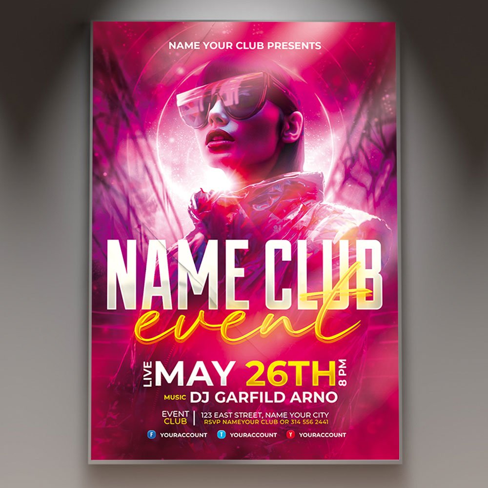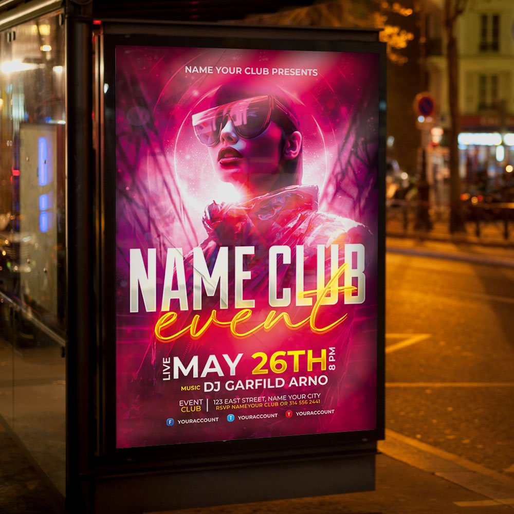 Name Club Event Flyer PSD TemplatePut your venue’s brand front and center with the Name Club Event Flyer PSD Template. Specifically engineered for the 2026 nightlife circuit, this professional design is the ultimate tool for establishing a signature identity for your venue. Whether you are launching a brand-new Saturday night residency, celebrating a high-profile club anniversary, or hosting an exclusive corporate mixer, this flyer provides the structural elegance and visual power needed to dominate the market. If you need a template that says “The Place to Be,” “Your Name, Your Sound,” or “The Elite 2026 Clubbing Experience,” this is your perfect solution. Featuring bold, customizable nameplates, high-definition 3D textures, and cinematic lighting, it ensures your club’s name is the most recognizable in the city. The Name Club Event Flyer PSD Template is built for absolute professional flexibility. As a fully layered Photoshop file, it allows for deep customization to match your club’s unique interior aesthetic and branding colors. You can easily update the primary nameplate, secondary text for guest DJs, the date, and venue location. Highlight your venue’s premium features such as exclusive VIP bottle service, immersive 3D projection mapping, early-bird guest list benefits, or specialty 2026 cocktail menus. The template utilizes smart objects and organized folders, making it simple to adjust the neon intensity, modify background smoke effects, and ensure every detail looks sharp and professional for your target audience. Designed for a digital-first marketing world, this Name Club Event Flyer is 100% print-ready and expertly optimized for viral social media impact. You can produce high-quality physical posters for street-level marketing while simultaneously exporting perfectly sized graphics for Instagram, TikTok, and Facebook. This ensures your club’s brand remains consistent across all platforms, driving ticket sales and building long-term residency hype. By choosing this high-impact and distinctive flyer, you aren’t just announcing a party; you’re building a destination brand. Download the Name Club Event Flyer PSD Template today and lead the 2026 nightlife scene! — Features of the Name Club Event Flyer PSD Template