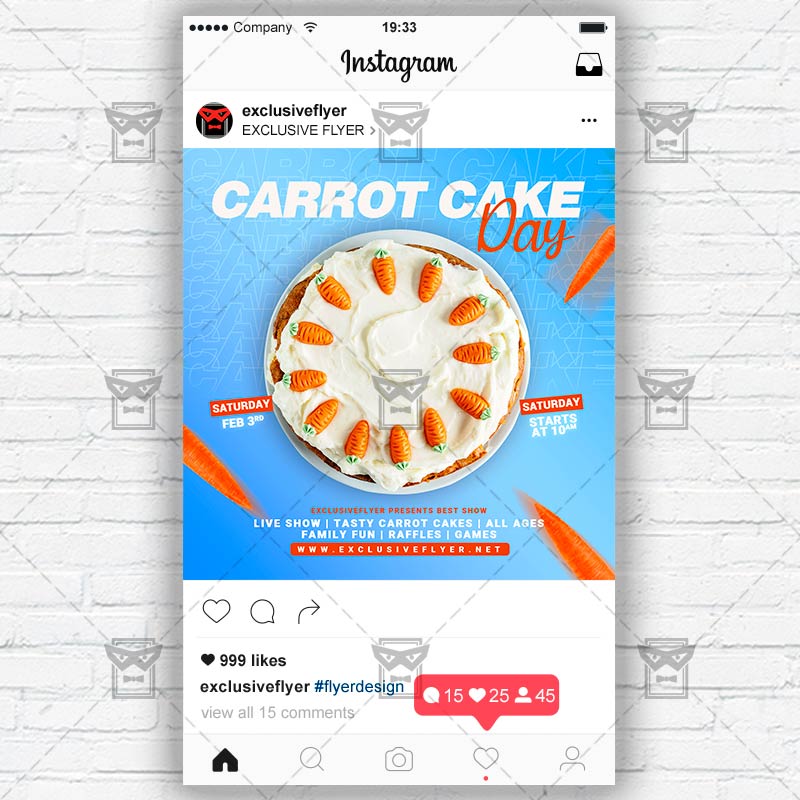 National Carrot Cake Day Flyer Template an exclusive PSD flyer template for Adobe Photoshop designed by our best graphic designers to facilitate your task in promoting your business. With our readymade Club flyer in psd format you can invite you customers and guest to your event or to the best Carrot Cake Event, Carrot Cake Day Celebration, Cakes Event, Cakes Party in their lives.