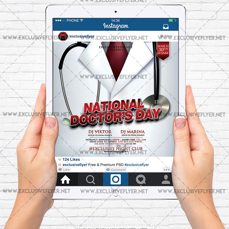The National Doctors Day is the exclusive Photoshop PSD flyer template designed by ExclusiveFlyer to promote your National Doctors Day. This is a modern, stylish flyer and just be used for a National Doctors Day, Doctor’s Day Celebration Party etc. Dear customers! – you can also: Customize any flyers or Hire Us to create any unique product. Also, you can get unlimited access to all our templates. You can buy 1 month membership, 3 or 6 months membership or even 1 year membership plan and login on site, choose a design, click the button DOWNLOAD TEMPLATE and it’s yours. No hassle, no checkout! When you paid the template, you can find it in your personal account and of course you’ve got a message to your e-mail (maybe in spam) with link to download. Also, you can find all templates, which you buy, in your personal account! All of our flyers have a very good quality (300DPI). And it means that you just need to download one of them and make the necessary modifications such as replace the elements or choose the colors and start to invite your guests! You can order from us design of Banner Ad, Bi-Fold Brochure, Tri-Fold Brochure, Business Card, Logo, One-Sided Flyer, Two-sided Flyer or Postcard. All you need is to checkout and write us all information on our e-mail or skype. (order now). There are a lot of free flyer templates, free business card templates on our site! Also there are a lot of categories of flyers such as club flyers, seasonal flyers, sport flyers and also business flyers. You have a great choise on our site, so good luck! Don’t forget to follow our Facebook community, our page on Twitter, on Pinterest and on Tumblr and leave comments, cause we work for you! PSD is set up in 1275×1875 dimension (4” x 6” with 0,25” bleed). The PSD file is very well organised, with color coded groups and layers named appropriately. Remember, all stock images of models and other people used only for demonstration all charms of the flyer and don’t included in the download!