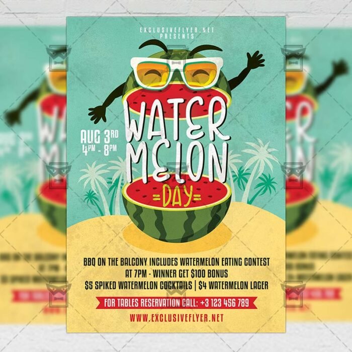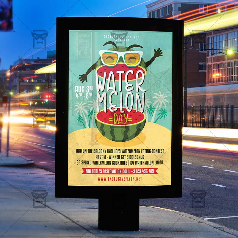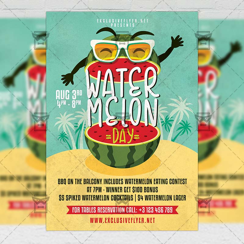 National Watermelon Day Template an exclusive PSD flyer template for Adobe Photoshop designed by our best graphic designers to facilitate your task in promoting your business. With our readymade Club flyer in psd format you can invite you customers and guest to your event or to the best Watermelon Day Celebration, Watermelon Eating Contest, National Watermelon Day or Watermelon Party in their lives.
