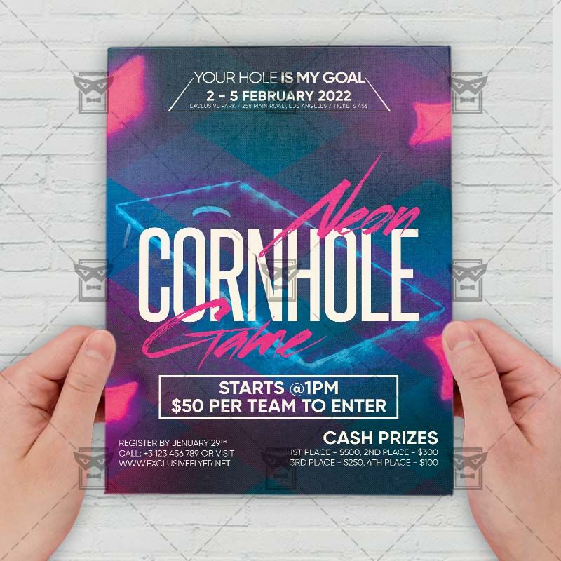Neon Cornhole Game Template an exclusive PSD flyer template for Adobe Photoshop designed by our best graphic designers to facilitate your task in promoting your business. This psd poster/flyer is the best choice for school competition, cornhole tournament, cornhole championship, cornhole event, cornhole derby or cornhole game. With our readymade Sport flyer in psd format you can invite you customers and guest to your event with a minimum of efforts and time.