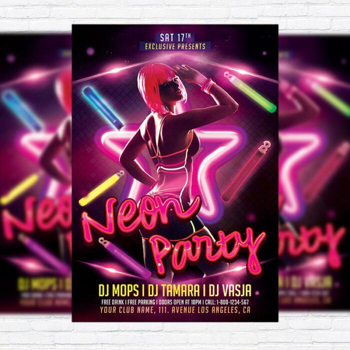 The Neon Party is the exclusive Photoshop PSD flyer template designed by ExclusiveFlyer to promote your Neon Party. This is a modern, stylish flyer and just be used for a Glow Party Night or Neon Night etc. Dear customers! – you can also: Customize any flyers or Hire Us to create any unique product. Also, you can get unlimited access to all our templates. You can buy 1 month membership, 3 or 6 months membership or even 1 year membership plan and login on site, choose a design, click the button DOWNLOAD TEMPLATE and it’s yours. No hassle, no checkout! When you paid the template, you can find it in your personal account and of course you’ve got a message to your e-mail (maybe in spam) with link to download. Also, you can find all templates, which you buy, in your personal account! All of our flyers have a very good quality (300DPI). And it means that you just need to download one of them and make the necessary modifications such as replace the elements or choose the colors and start to invite your guests! You can order from us design of Banner Ad, Bi-Fold Brochure, Tri-Fold Brochure, Business Card, Logo, One-Sided Flyer, Two-sided Flyer or Postcard. All you need is to checkout and write us all information on our e-mail or skype. (order now). There are a lot of free flyer templates, free business card templates on our site! Also there are a lot of categories of flyers such as club flyers, seasonal flyers, sport flyers and also business flyers. You have a great choise on our site, so good luck! Don’t forget to follow our Facebook community, our page on Twitter, on Pinterest and on Tumblr and leave comments, cause we work for you! PSD is set up in 1275×1875 dimension (4″×6″ with 0,25″ bleed). The PSD file is very well organised, with color coded groups and layers named appropriately. Remember, all stock images of models and other people used only for demonstration all charms of the flyer and don’t included in the download!