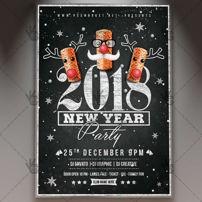 New Year Party is a simply modern flyer design by PSDmarket Team to be used with Photoshop CS3 and higher. Save your time and use it for business or for your clients! This can be use for Christmas Party, Christmas Night, New Year Night, Winter Party, Christmas Madness or Happy New Year and others.