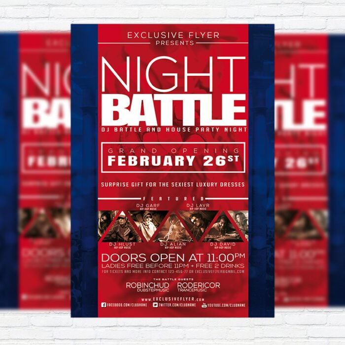 The Night Battle is the exclusive Photoshop PSD flyer template designed by ExclusiveFlyer to promote your Night Battle party. This is a modern, stylish flyer and just be used to promote DJ Battle or Night Battle party, or Night party. Dear customers! – you can also: Customize any flyers or Hire Us to create any unique product. Also, you can get unlimited access to all our templates. You can buy 1 month membership, 3 or 6 months membership or even 1 year membership plan and login on site, choose a design, click the button DOWNLOAD TEMPLATE and it’s yours. No hassle, no checkout! When you paid the template, you can find it in your personal account and of course you’ve got a message to your e-mail (maybe in spam) with link to download. Also, you can find all templates, which you buy, in your personal account! All of our flyers have a very good quality (300DPI). And it means that you just need to download one of them and make the necessary modifications such as replace the elements or choose the colors and start to invite your guests! You can order from us design of Banner Ad, Bi-Fold Brochure, Tri-Fold Brochure, Business Card, Logo, One-Sided Flyer, Two-sided Flyer or Postcard. All you need is to checkout and write us all information on our e-mail or skype. (order now). There are a lot of free flyer templates, free business card templates on our site! Also there are a lot of categories of flyers such as club flyers, seasonal flyers, sport flyers and also business flyers. You have a great choise on our site, so good luck! Don’t forget to follow our Facebook community, our page on Twitter, on Pinterest and on Tumblr and leave comments, cause we work for you! PSD is set up in 1275×1875 dimension (4″×6″ with 0,25″ bleed). The PSD file is very well organised, with color coded groups and layers named appropriately. Remember, all stock images of models and other people used only for demonstration all charms of the flyer and don’t included in the download!