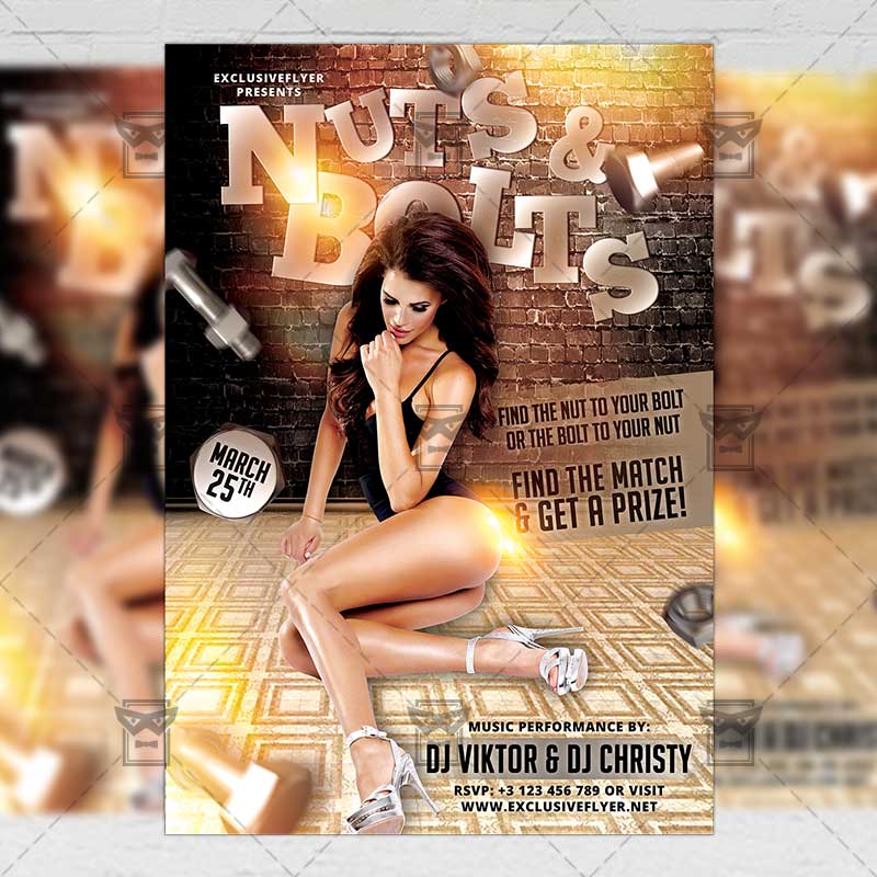 Nuts and Bolts Party is an exclusive PSD flyer template for Adobe Photoshop designed by our best graphic designers to facilitate your task in promoting your business. With our readymade Nuts and Bolts Party flyer in psd format you can invite you customers and guest to your event or to the best Nuts and Bolts Party Night, Spped Dating Fridays, Love Night or Club Party in their lives.