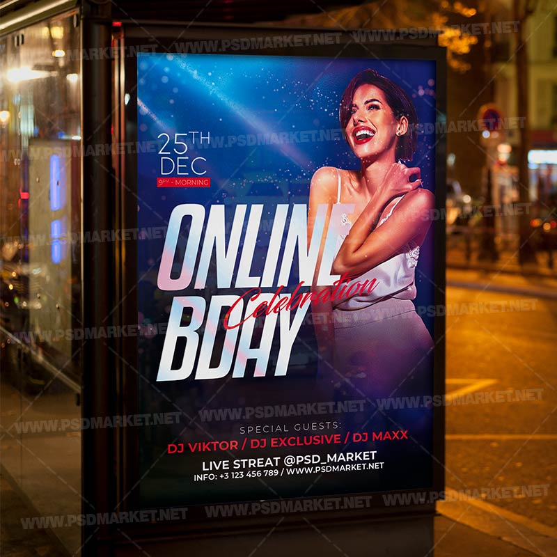 Online Birthday Template is a simply modern flyer design by PSDmarket Team to be used with Photoshop CS3 and higher. Save your time and use it for business or for your clients! This can be use for Online Birthday Celebration, Online Bday, Online Birthday, Online Party, Online Stream Party, Live Party, Live Night, Pajamas Party, House Party, Home Night and others.