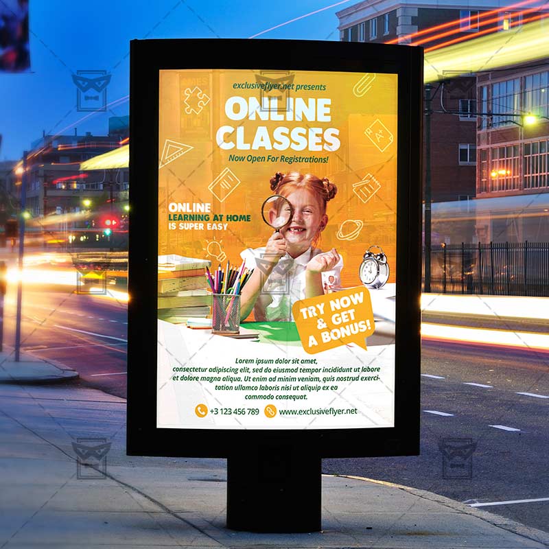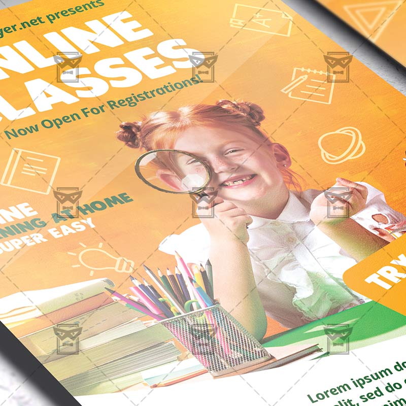 Online Classes Template an exclusive PSD flyer template for Adobe Photoshop designed by our best graphic designers to facilitate your task in promoting your business. With our readymade flyer in psd format you can inform your students, pupils and their parents about school timing, lessons, meeting etc.