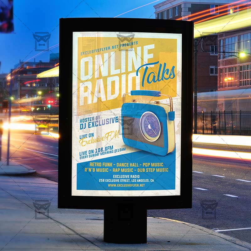 Online Radio Talks Template an exclusive PSD flyer template for Adobe Photoshop designed by our best graphic designers to facilitate your task in promoting your business. With our readymade Club flyer in psd format you can invite you customers and guest to your event or to the best Radio Show, Radio Talk Show, Online Radio, Radio Night or Radio Party in their lives.