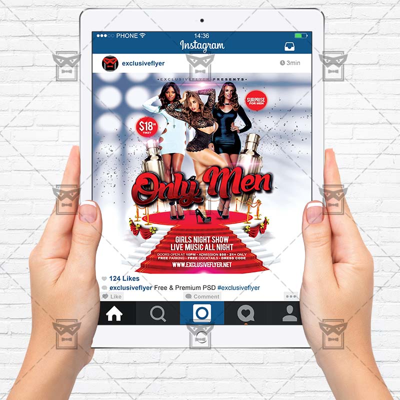 The Only Men is the exclusive Photoshop PSD flyer template designed by ExclusiveFlyer to promote your Only Men Party. This is a modern, stylish flyer and just be used for a Only Men Night, Show Girls, Men’s Club, Striptease Show etc. Dear customers! – you can also: Customize any flyers or Hire Us to create any unique product. Also, you can get unlimited access to all our templates. You can buy 1 month membership, 3 or 6 months membership or even 1 year membership plan and login on site, choose a design, click the button DOWNLOAD TEMPLATE and it’s yours. No hassle, no checkout! When you paid the template, you can find it in your personal account and of course you’ve got a message to your e-mail (maybe in spam) with link to download. Also, you can find all templates, which you buy, in your personal account! All of our flyers have a very good quality (300DPI). And it means that you just need to download one of them and make the necessary modifications such as replace the elements or choose the colors and start to invite your guests! You can order from us design of Banner Ad, Bi-Fold Brochure, Tri-Fold Brochure, Business Card, Logo, One-Sided Flyer, Two-sided Flyer or Postcard. All you need is to checkout and write us all information on our e-mail or skype. (order now). There are a lot of free flyer templates, free business card templates on our site! Also there are a lot of categories of flyers such as club flyers, seasonal flyers, sport flyers and also business flyers. You have a great choise on our site, so good luck! Don’t forget to follow our Facebook community, our page on Twitter, on Pinterest and on Tumblr and leave comments, cause we work for you! PSD is set up in 1275×1875 dimension (4” x 6” with 0,25” bleed). The PSD file is very well organised, with color coded groups and layers named appropriately. Remember, all stock images of models and other people used only for demonstration all charms of the flyer and don’t included in the download!