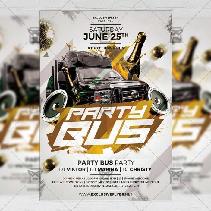Party Bus Night an exclusive PSD flyer template for Adobe Photoshop designed by our best graphic designers to facilitate your task in promoting your business. With our readymade Club flyer in psd format you can invite you customers and guest to your event or to the best Bus Party, Party Bus Night or Party Bus Event in their lives.