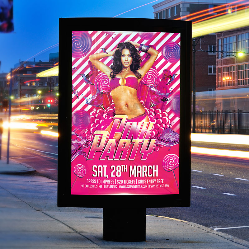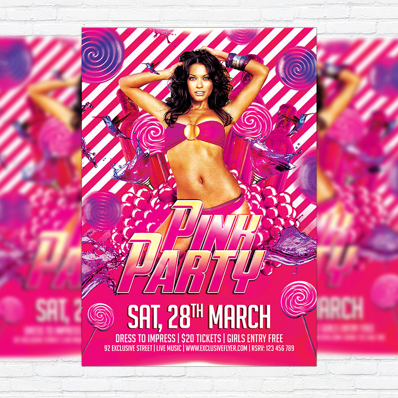 The Pink Party is the exclusive Photoshop PSD flyer template designed by ExclusiveFlyer to promote your Pink Party. This is a modern, stylish flyer and just be used for a Ladies Party or Woman’s Night or Valentines Day etc. Dear customers! – you can also: Customize any flyers or Hire Us to create any unique product. Also, you can get unlimited access to all our templates. You can buy 1 month membership, 3 or 6 months membership or even 1 year membership plan and login on site, choose a design, click the button DOWNLOAD TEMPLATE and it’s yours. No hassle, no checkout! When you paid the template, you can find it in your personal account and of course you’ve got a message to your e-mail (maybe in spam) with link to download. Also, you can find all templates, which you buy, in your personal account! All of our flyers have a very good quality (300DPI). And it means that you just need to download one of them and make the necessary modifications such as replace the elements or choose the colors and start to invite your guests! You can order from us design of Banner Ad, Bi-Fold Brochure, Tri-Fold Brochure, Business Card, Logo, One-Sided Flyer, Two-sided Flyer or Postcard. All you need is to checkout and write us all information on our e-mail or skype. (order now). There are a lot of free flyer templates, free business card templates on our site! Also there are a lot of categories of flyers such as club flyers, seasonal flyers, sport flyers and also business flyers. You have a great choise on our site, so good luck! Don’t forget to follow our Facebook community, our page on Twitter, on Pinterest and on Tumblr and leave comments, cause we work for you! PSD is set up in 1275×1875 dimension (4” x 6” with 0,25” bleed). The PSD file is very well organised, with color coded groups and layers named appropriately. Remember, all stock images of models and other people used only for demonstration all charms of the flyer and don’t included in the download!