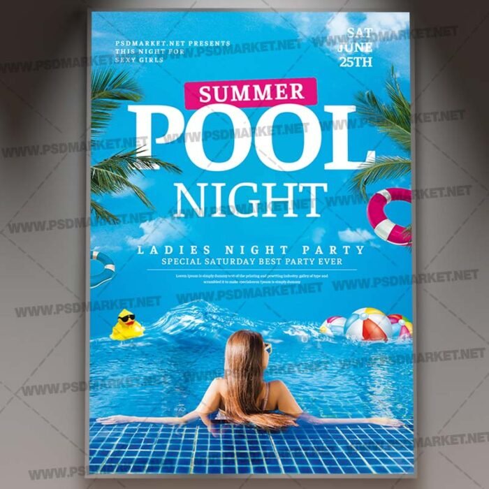 Pool Night Template Flyer PSD is a simply modern flyer design by PSDmarket Team to be used with Photoshop CS3 and higher. Save your time and use it for business or for your clients! This can be use for Pool Night, Pool Partyt, Pool Event, Summer Night Part, Summer Time, Summer Party, Summer Vibes, Summer Madness Party, Summer Night, Summer Time Party, Club Summer Party, Summer Dj Night, Summer Ibiza Party and others.
