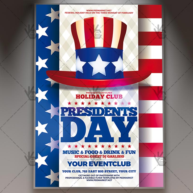 Presidents Day is a simply modern flyer design by PSDmarket Team to be used with Photoshop CS3 and higher. Save your time and use it for business or for your clients! This can be use for Presidents Day Party, Presidents Day Event, Presidents Day Celebration, Memorial Day Patriotic, Patriot Day, Honor Day, Veterans Day Party, Memorial Party and others.
