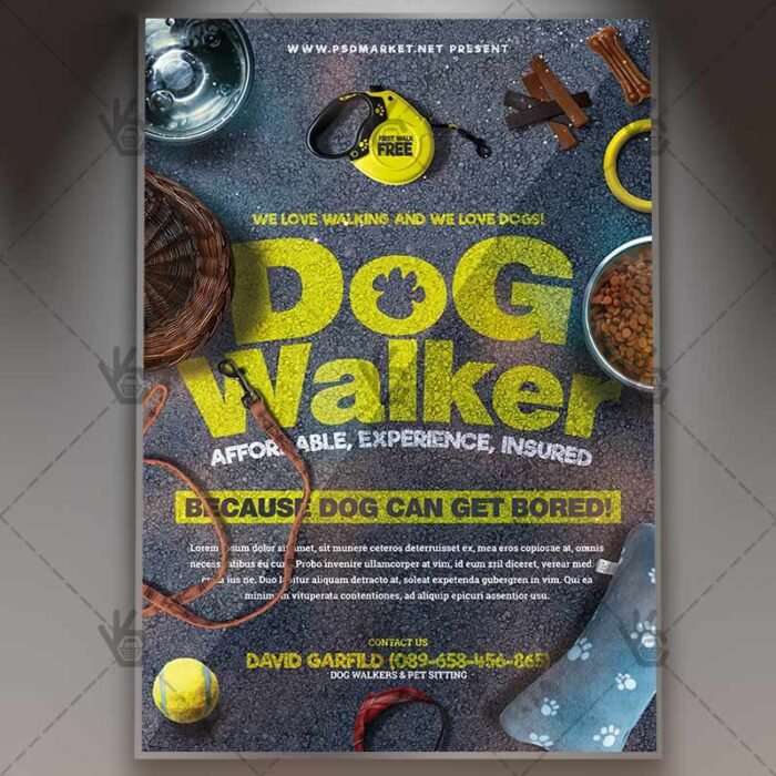 Professional Dog Walker is a simply modern flyer design by PSDmarket Team to be used with Photoshop CS3 and higher. Save your time and use it for business or for your clients! This can be use for Cat Walkers, Dog Walking Services, Walking Services, Cat Walking Services, Pet Walkers, Pet Walking Services and others.