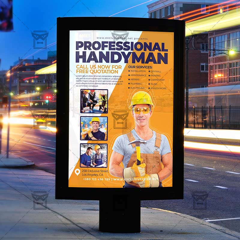 Professional Handyman Template an exclusive PSD flyer template for Adobe Photoshop designed by our best graphic designers to facilitate your task in promoting your business. This readymade flyer in psd format is perfect for upscale handyman services, building companies, handyman agencies, tradesman services, repair services. With our Professional Handyman templates, we’ve tried to create a design that you can use a wide variety of construction related businesses. The design is modern, stylish, exclusive, fashionable and most of all, confident.