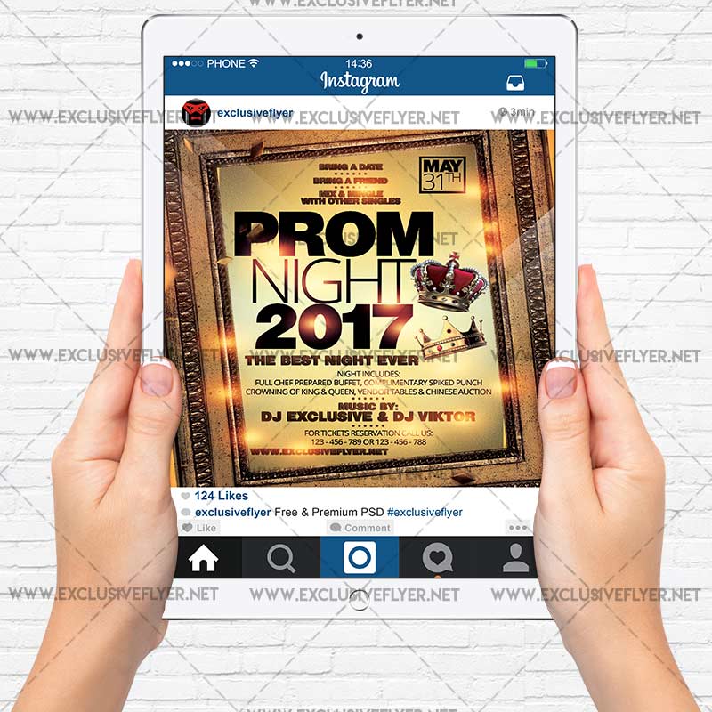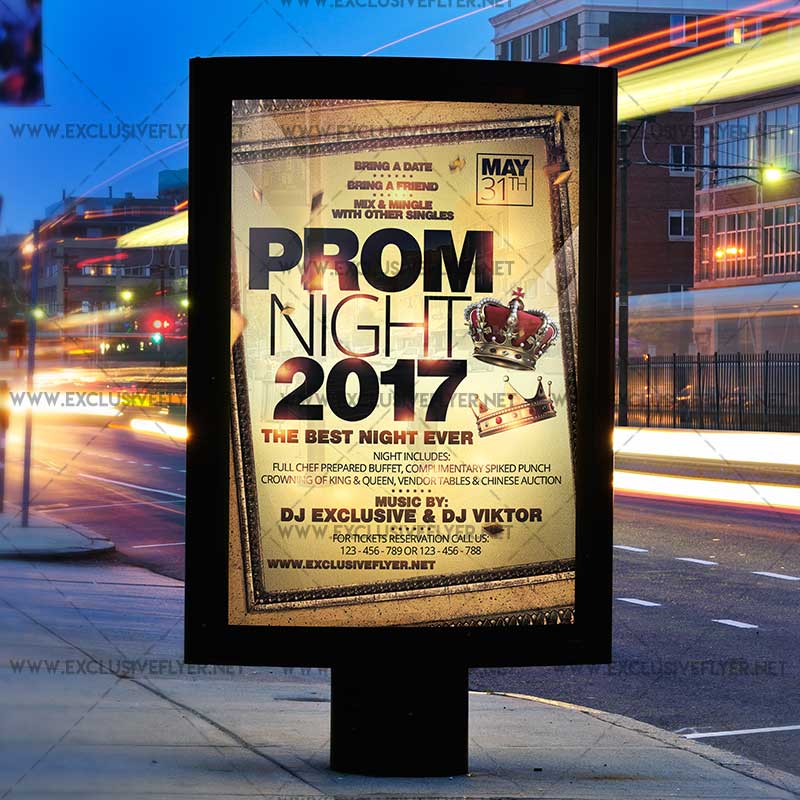 The Prom Night is the exclusive Photoshop PSD flyer template designed by ExclusiveFlyer to promote your Prom Party Night. This is a modern, stylish flyer and just be used for a Prom Party, Last School Party, Vip Party etc. Dear customers! – you can also: Customize any flyers or Hire Us to create any unique product. Also, you can get unlimited access to all our templates. You can buy 1 month membership, 3 or 6 months membership or even 1 year membership plan and login on site, choose a design, click the button DOWNLOAD TEMPLATE and it’s yours. No hassle, no checkout! When you paid the template, you can find it in your personal account and of course you’ve got a message to your e-mail (maybe in spam) with link to download. Also, you can find all templates, which you buy, in your personal account! All of our flyers have a very good quality (300DPI). And it means that you just need to download one of them and make the necessary modifications such as replace the elements or choose the colors and start to invite your guests! You can order from us design of Banner Ad, Bi-Fold Brochure, Tri-Fold Brochure, Business Card, Logo, One-Sided Flyer, Two-sided Flyer or Postcard. All you need is to checkout and write us all information on our e-mail or skype. (order now). There are a lot of free flyer templates, free business card templates on our site! Also there are a lot of categories of flyers such as club flyers, seasonal flyers, sport flyers and also business flyers. You have a great choise on our site, so good luck! Don’t forget to follow our Facebook community, our page on Twitter, on Pinterest and on Tumblr and leave comments, cause we work for you! PSD is set up in 1275×1875 dimension (4” x 6” with 0,25” bleed). The PSD file is very well organised, with color coded groups and layers named appropriately. Remember, all stock images of models and other people used only for demonstration all charms of the flyer and don’t included in the download!