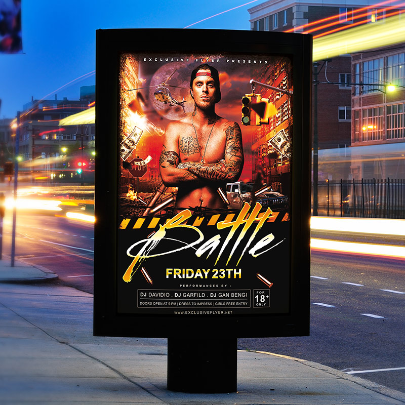 The Rapper Battle is the exclusive Photoshop PSD flyer template designed by ExclusiveFlyer to promote your Rapper Battle. This is a modern, stylish, black flyer and just be used for a Dance Battle or maybe DJ Battle. Dear customers! – you can also: Customize any flyers or Hire Us to create any unique product. Also, you can get unlimited access to all our templates. You can buy 1 month membership, 3 or 6 months membership or even 1 year membership plan and login on site, choose a design, click the button DOWNLOAD TEMPLATE and it’s yours. No hassle, no checkout! When you paid the template, you can find it in your personal account and of course you’ve got a message to your e-mail (maybe in spam) with link to download. Also, you can find all templates, which you buy, in your personal account! All of our flyers have a very good quality (300DPI). And it means that you just need to download one of them and make the necessary modifications such as replace the elements or choose the colors and start to invite your guests! You can order from us design of Banner Ad, Bi-Fold Brochure, Tri-Fold Brochure, Business Card, Logo, One-Sided Flyer, Two-sided Flyer or Postcard. All you need is to checkout and write us all information on our e-mail or skype. (order now). There are a lot of free flyer templates, free business card templates on our site! Also there are a lot of categories of flyers such as club flyers, seasonal flyers, sport flyers and also business flyers. You have a great choise on our site, so good luck! Don’t forget to follow our Facebook community, our page on Twitter, on Pinterest and on Tumblr and leave comments, cause we work for you! PSD is set up in 1275×1875 dimension (4″×6″ with 0,25″ bleed). The PSD file is very well organised, with color coded groups and layers named appropriately. Remember, all stock images of models and other people used only for demonstration all charms of the flyer and don’t included in the download!