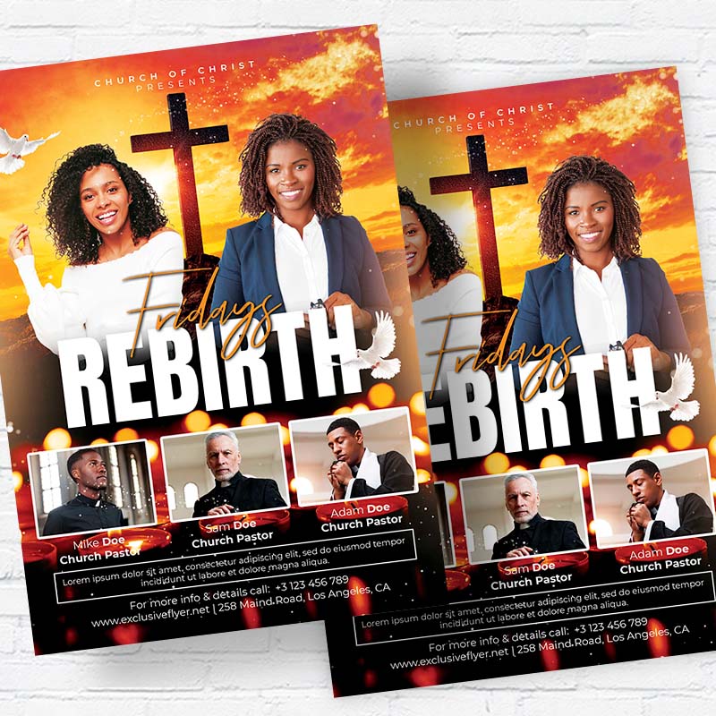 Rebirth Fridays Template an exclusive PSD flyer template for Adobe Photoshop designed by our best graphic designers to facilitate your task in promoting your business. This psd poster/flyer is the best choice for Worship Church Night Music, Church Event, Gospel Pray, Bible Study Event, Worship Night. With our readymade Rebirth Fridays flyer in psd format you can invite you customers and guest to your event with a minimum of efforts and time.