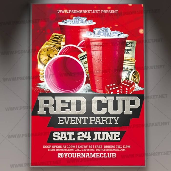 Red Cup Party PSD Template Flyer is a simply modern flyer design by PSDmarket Team to be used with Adobe Photoshop CS3 and higher. Save your time and use it for business or for your clients! This can be use for for Red Cup Night Event, Red Cup Party Day, Red Cup Celebration, Red Cup Party Night, Red Cup Party or Red Cup Club Night and others.