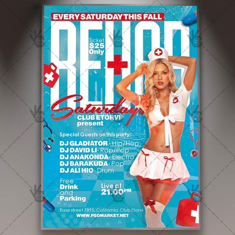 Rehab Party is a simply modern flyer design by PSDmarket Team to be used with Photoshop CS3 and higher. Save your time and use it for business or for your clients! This can be use for Hospital Party, Rehab Night, Hospital Night, Rehab Saturdays, Rehab After Party, Rehab Weekend and others.