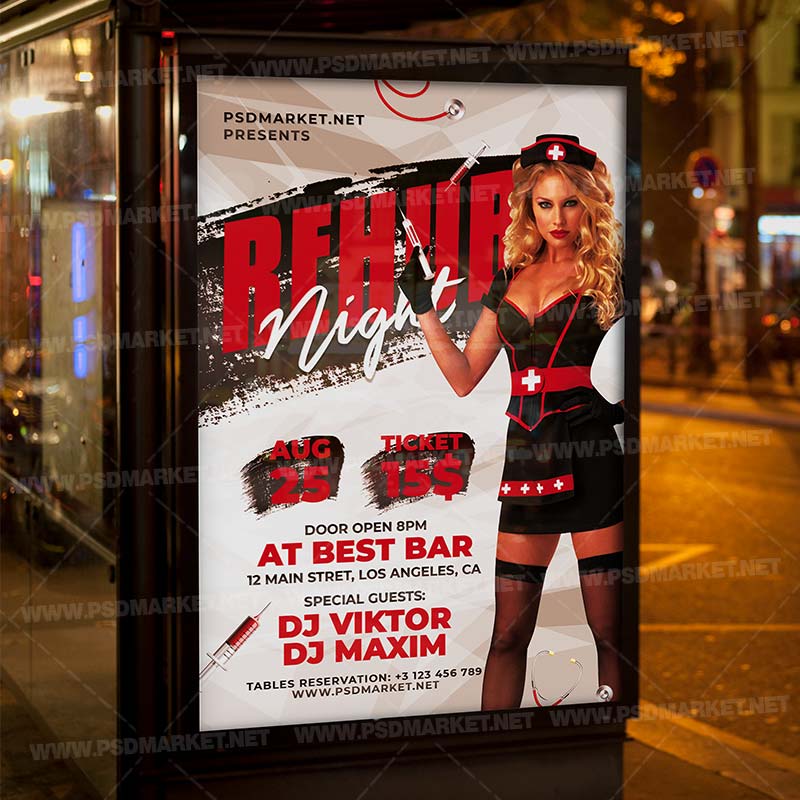 Rehub Night Flyer is a simply modern flyer design by PSDmarket Team to be used with Photoshop CS3 and higher. Save your time and use it for business or for your clients! This can be use for Rehub Party, Hospital Night, Rehub Party Night, Rehub Costume Party and others.