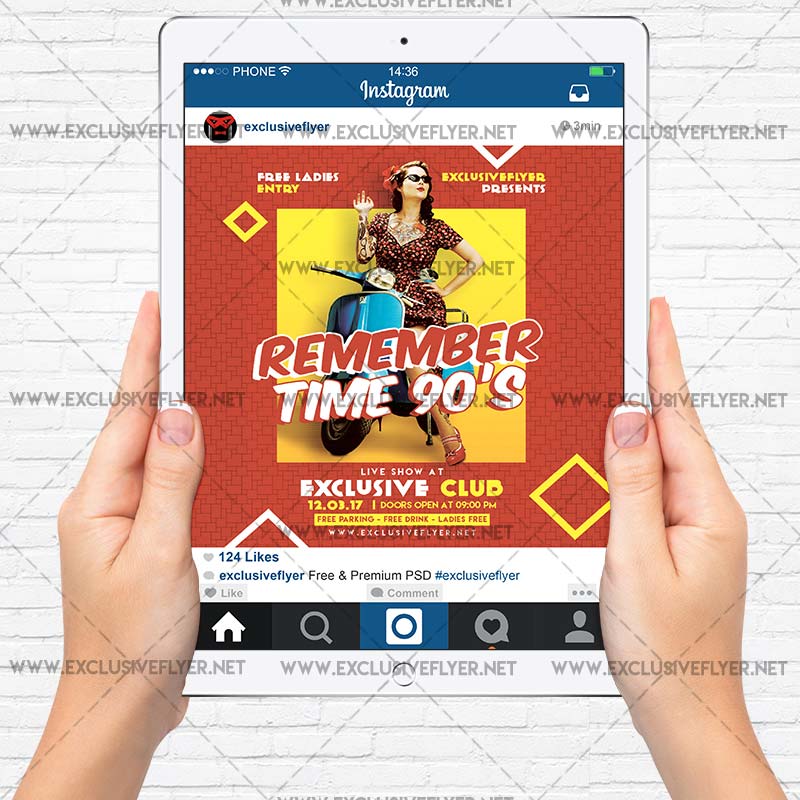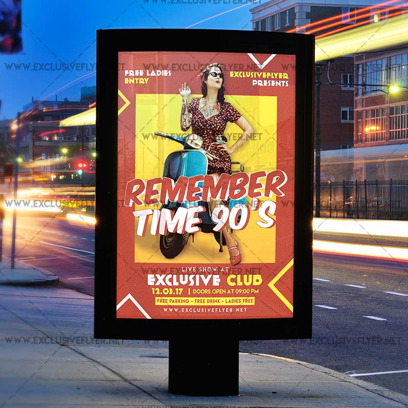 The Remember Time 90’s is the exclusive Photoshop PSD flyer template designed by ExclusiveFlyer to promote your Remember Time 90’s Party. This is a modern, stylish flyer and just be used for a Retro Party, Vintage Night, 90’s Night, 80’s Party etc. Dear customers! – you can also: Customize any flyers or Hire Us to create any unique product. Also, you can get unlimited access to all our templates. You can buy 1 month membership, 3 or 6 months membership or even 1 year membership plan and login on site, choose a design, click the button DOWNLOAD TEMPLATE and it’s yours. No hassle, no checkout! When you paid the template, you can find it in your personal account and of course you’ve got a message to your e-mail (maybe in spam) with link to download. Also, you can find all templates, which you buy, in your personal account! All of our flyers have a very good quality (300DPI). And it means that you just need to download one of them and make the necessary modifications such as replace the elements or choose the colors and start to invite your guests! You can order from us design of Banner Ad, Bi-Fold Brochure, Tri-Fold Brochure, Business Card, Logo, One-Sided Flyer, Two-sided Flyer or Postcard. All you need is to checkout and write us all information on our e-mail or skype. (order now). There are a lot of free flyer templates, free business card templates on our site! Also there are a lot of categories of flyers such as club flyers, seasonal flyers, sport flyers and also business flyers. You have a great choise on our site, so good luck! Don’t forget to follow our Facebook community, our page on Twitter, on Pinterest and on Tumblr and leave comments, cause we work for you! PSD is set up in 1819×2551 dimension. The PSD file is very well organised, with color coded groups and layers named appropriately. Remember, all stock images of models and other people used only for demonstration all charms of the flyer and don’t included in the download!