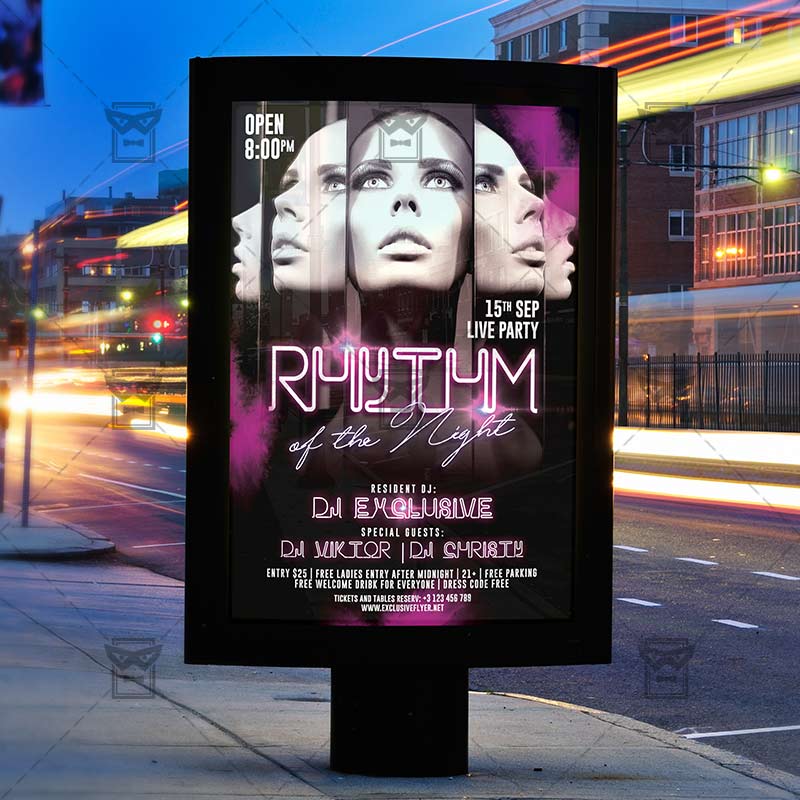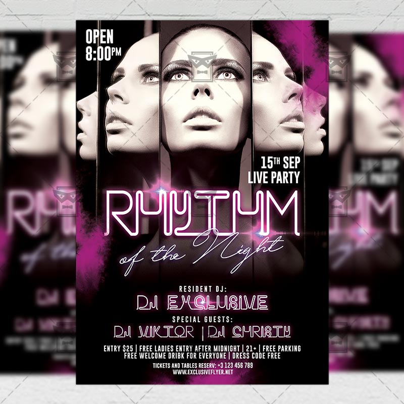 Rhythm of the Night is an exclusive PSD flyer template for Adobe Photoshop designed by our best graphic designers to facilitate your task in promoting your business. With our readymade Club flyer in psd format you can invite you customers and guest to your event or to the best Rhythm of the Night, Rhythm Party, Club Vibes Night or All Night Long Party in their lives.